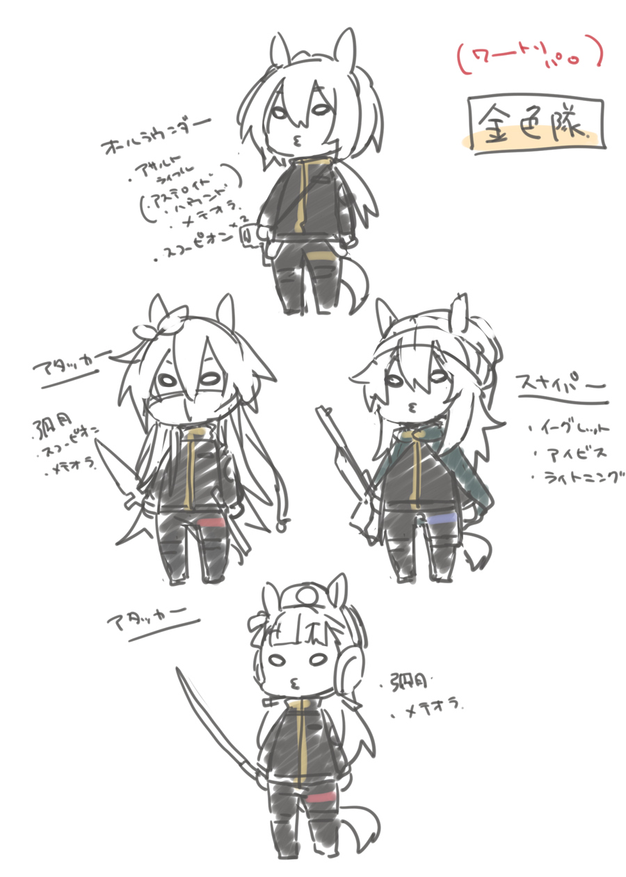 4girls animal_ears beer_hsk black_boots black_jacket black_pants boots bow chibi ear_covers ear_ribbon gold_ship_(umamusume) hair_between_eyes hat highres holding holding_weapon horse_ears horse_girl horse_tail jacket kin'iro_ryotei_(umamusume) long_hair low_ponytail mask mini_hat mouth_mask multiple_girls nakayama_festa_(umamusume) o3o orfevre_(old_design)_(umamusume) pants ponytail tail translation_request umamusume very_long_hair weapon weapon_request white_background wide_oval_eyes