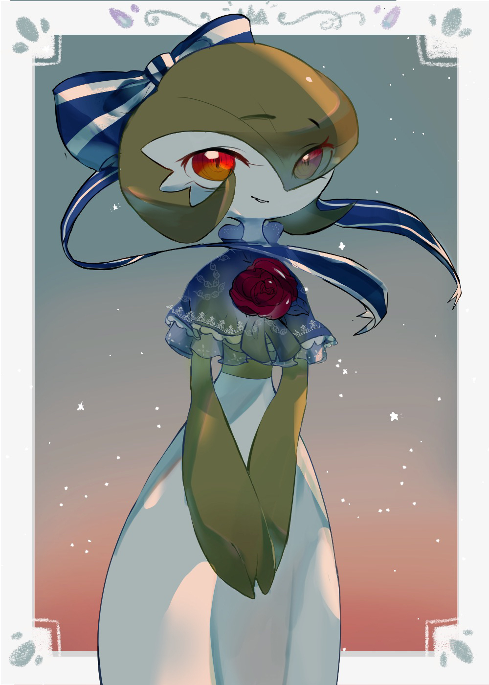 1girl backlighting blue_bow blue_capelet blue_ribbon bob_cut border bow capelet clothed_pokemon colored_skin eyes_visible_through_hair female_focus flower frilled_capelet frills gardevoir gen_3_pokemon gradient_background green_hair green_skin hair_bow hair_over_one_eye hair_ribbon happy light_particles looking_at_viewer multicolored_skin nintendo outside_border own_hands_together parted_lips pokemon pokemon_(creature) powerpuff_(pixiv_60944739) red_eyes red_flower red_rose ribbon rose see-through_capelet see-through_clothes short_hair simple_background smile solo standing two-tone_skin v_arms white_border white_skin