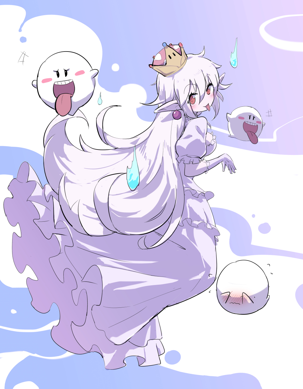 +++ 1girl boo_(mario) breasts brown_eyes commentary_request covering_own_eyes dress earrings elbow_gloves ghost gloves highres hitodama jewelry long_hair looking_at_viewer mario_(series) nejikyuu nintendo pointy_ears princess_king_boo super_crown tongue tongue_out white_dress white_hair