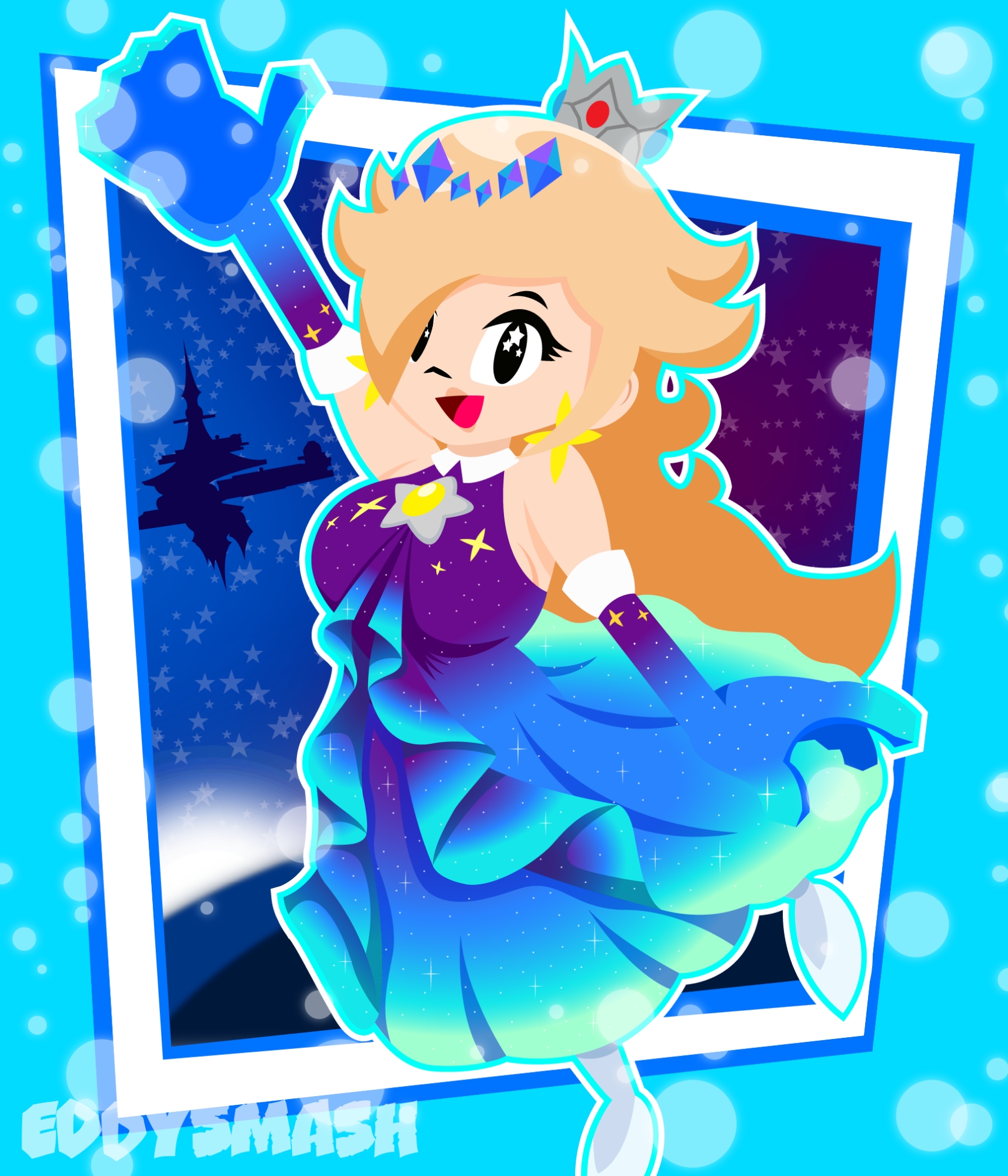 1girl artist_logo artist_name blue_dress blue_gem breasts brooch collar commentary crown dress ear_piercing earrings eddysmash2407 elbow_gloves english_commentary gem gem_hair_ornament gloves gradient_clothes gradient_dress hair_over_one_eye high_heels highres jewelry logo looking_at_viewer mario_(series) mario_kart mario_kart_tour mario_kart_world nintendo official_alternate_costume open_mouth piercing pumps purple_dress red_gemstone rosalina rosalina_(aurora) shoes silver_crown smile solo star_(sky) star_(symbol) star_brooch star_earrings starry_sky_print tongue watermark white_collar white_shoes yellow_gem