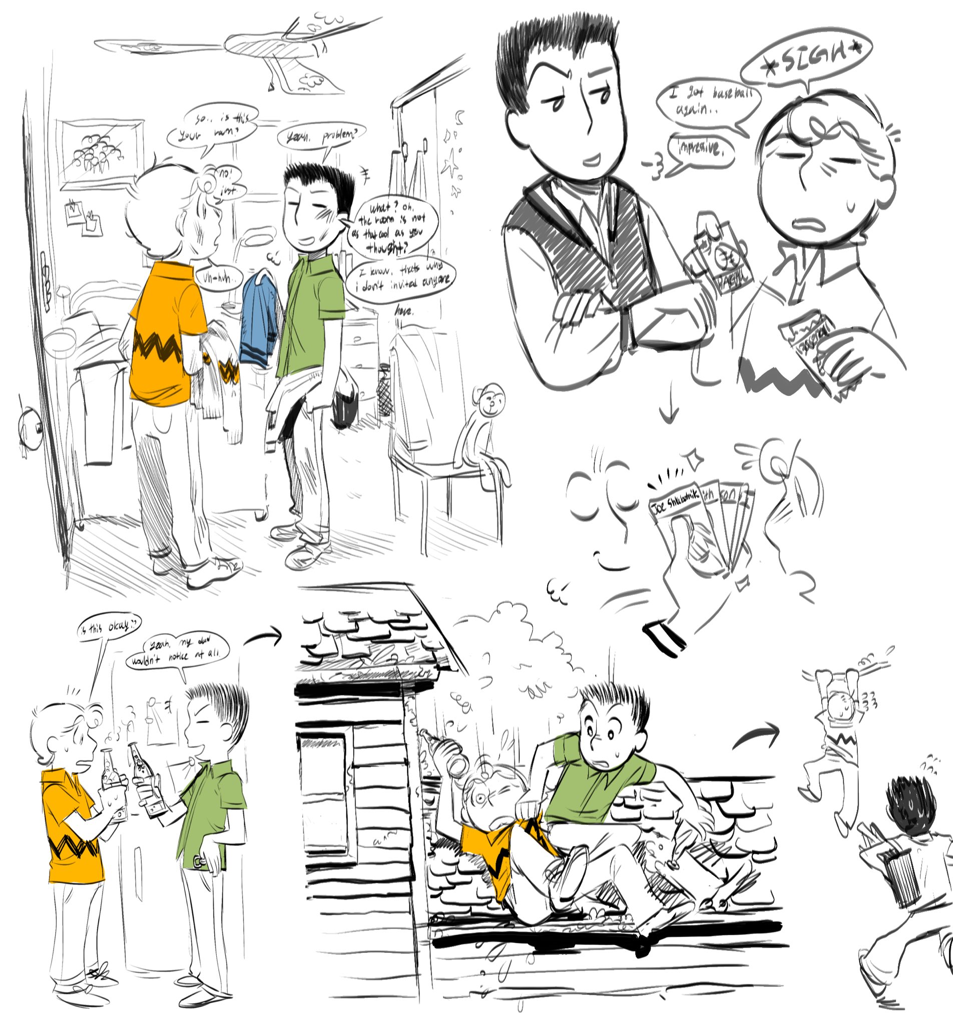 2boys aged_up alcohol bedroom beer beer_bottle black_hair bottle charlie_brown commentary dubu274611 english_commentary green_shirt highres holding holding_bottle male_focus multiple_boys peanuts_(comic) shermy_(peanuts) shirt short_hair spiked_hair yellow_shirt