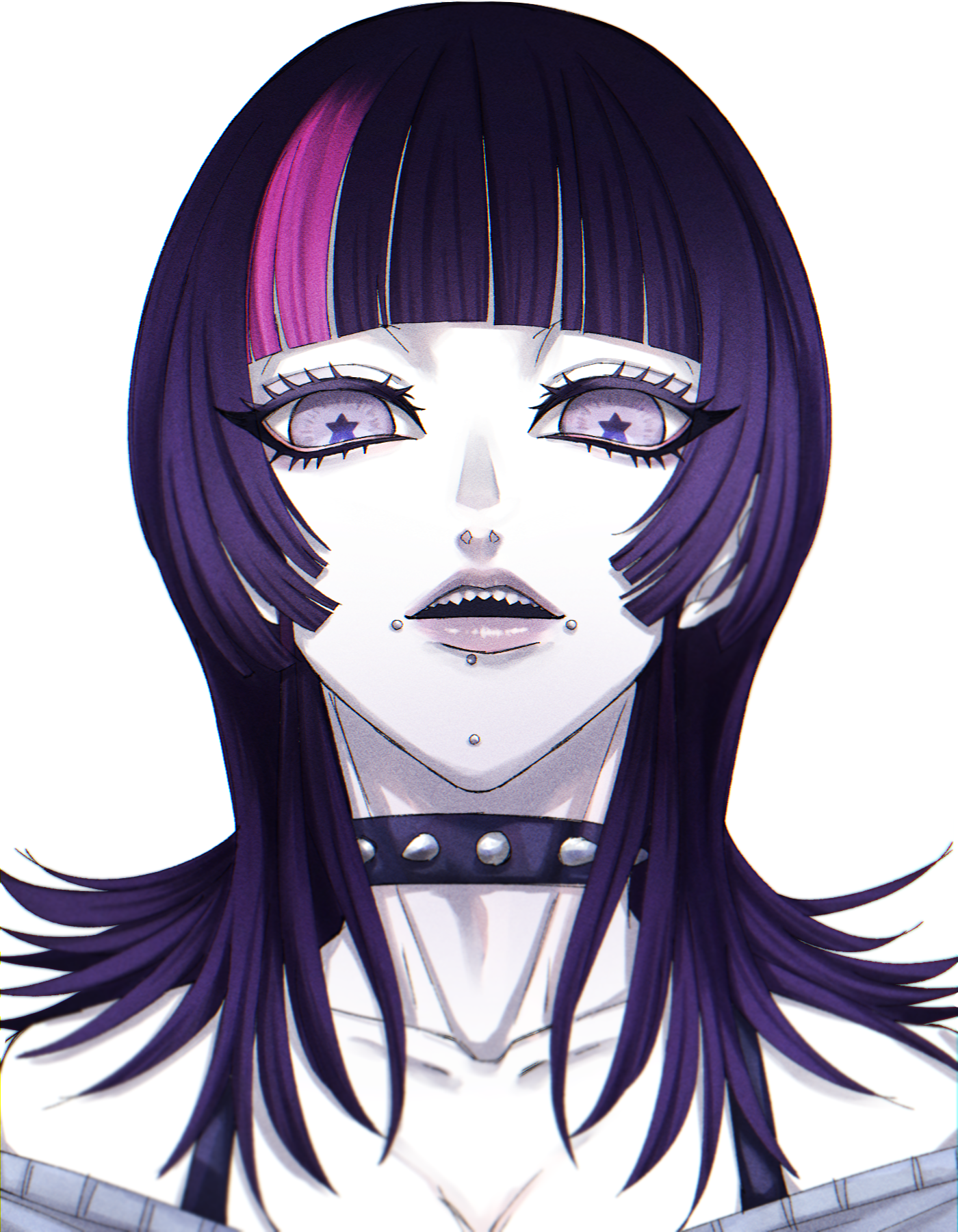 1boy androgynous crossdressing crossdressing_(mtf) expressionless eyelashes face_piercing highres hoshi_kirara jujutsu_kaisen lips looking_at_viewer mouth_piercing multicolored_hair navel open_mouth parted_lips piercing sharp_teeth solo split-color_hair star-shaped_pupils star_(symbol) symbol-shaped_pupils teeth trap uodakeiiii upper_body white_background