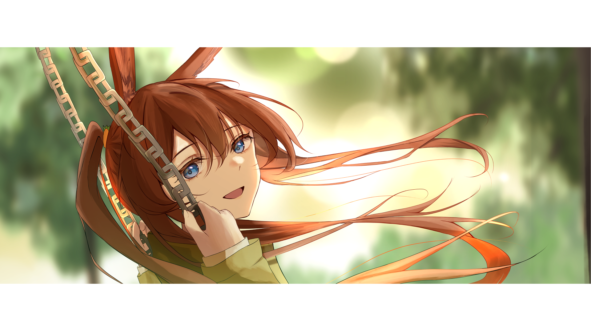 1girl :d amiya_(arknights) animal_ears arknights blue_eyes blurry blurry_background border brown_hair chain commentary_request from_side green_jacket hands_up highres holding holding_chain jacket letterboxed long_hair long_sleeves looking_at_viewer on_swing open_mouth outdoors ponytail portrait rabbit_ears sleeves_past_wrists smile solo swing swinging_on_swing turning_head yuu_(kranblume)