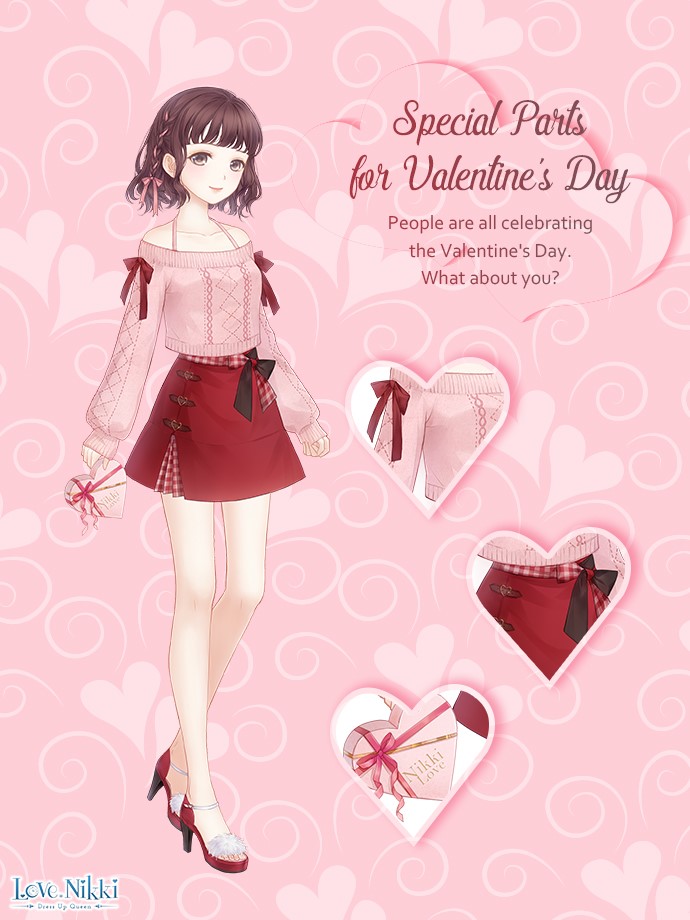 1girl artist_request bare_legs bare_shoulders black_bow blunt_bangs bow box box_of_chocolates bra_strap brown_eyes brown_hair close-up closed_mouth collarbone copyright_logo english_text eyelashes full_body hair_bow hair_ribbon happy heart heart-shaped_box heart_background high_heel_sandals high_heels holding holding_box light_blush lipstick logo long_sleeves looking_at_viewer makeup miniskirt miracle_nikki nikki_(series) no_socks off-shoulder_sweater off_shoulder official_art pink_background pink_bow pink_lips pink_ribbon pink_sweater plaid_bow pom_pom_(clothes) puffy_long_sleeves puffy_sleeves red_bow red_sandals red_skirt ribbon sandals short_hair skirt sleeve_bow sleeves_past_wrists smile solo standing sweater tareme third-party_source tress_ribbon two-tone_bow valentine waist_bow wavy_hair words_of_first_lovers_(miracle_nikki)