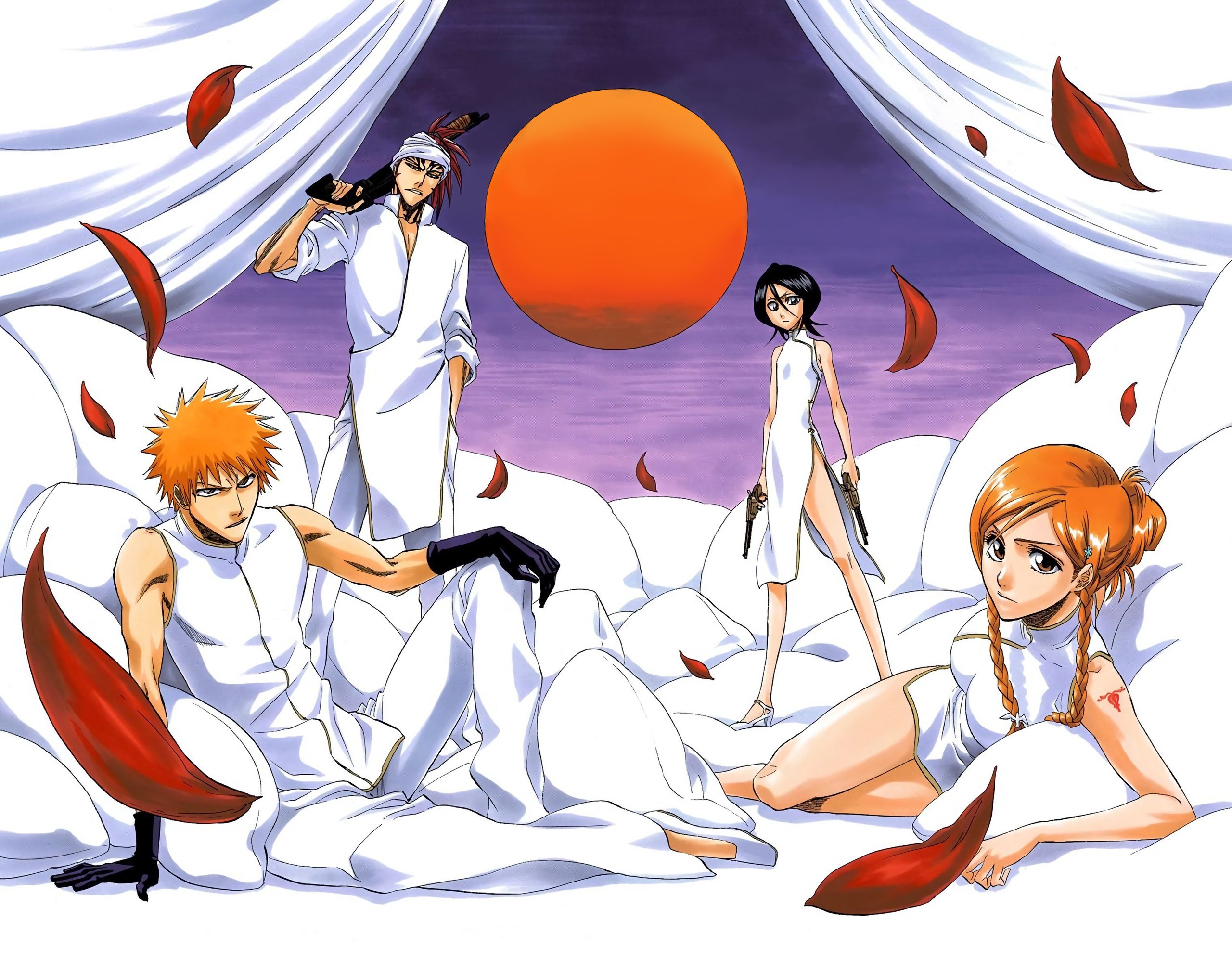00s 2007 2boys 2girls abarai_renji alternate_hairstyle alternate_weapon arm_support bandana bare_shoulders black_gloves black_hair bleach braid breasts china_dress chinese_clothes curtains dress dual_wielding facial_tattoo gloves gun hair_between_eyes hair_bun hair_ornament hair_up hairclip hand_in_pocket handgun high_heels high_ponytail highres holding holding_weapon inoue_orihime kubo_tite kuchiki_rukia kurosaki_ichigo large_breasts long_legs lying multiple_boys multiple_girls official_art on_side orange_eyes orange_hair over_shoulder pants parted_lips petals ponytail red_hair revolver second-party_source shoes short_dress short_hair short_hair_with_long_locks shotgun side_slit single_hair_bun sitting sleeves_rolled_up small_breasts spiked_hair standing swept_bangs tattoo toned turtleneck twin_braids weapon weapon_over_shoulder