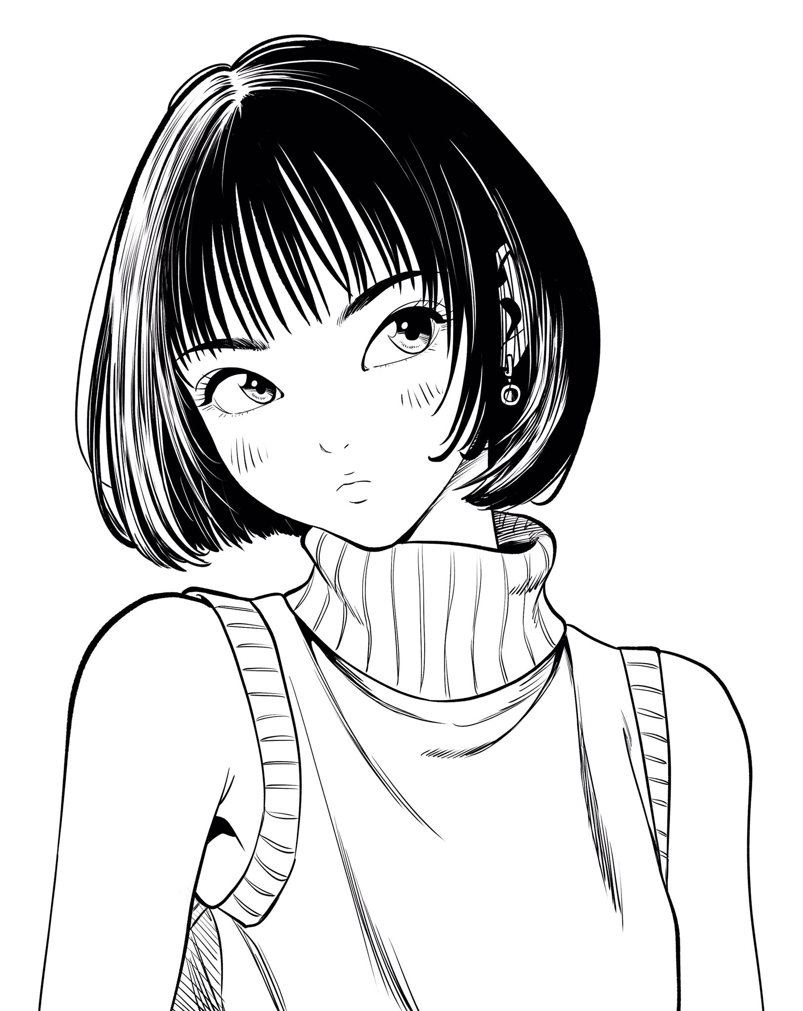 1girl bob_cut breasts commentary_request earrings frown head_tilt highres jewelry lee_(dragon_garou) light_blush lips looking_up monochrome original short_hair sleeveless sleeveless_turtleneck small_breasts solo turtleneck upper_body