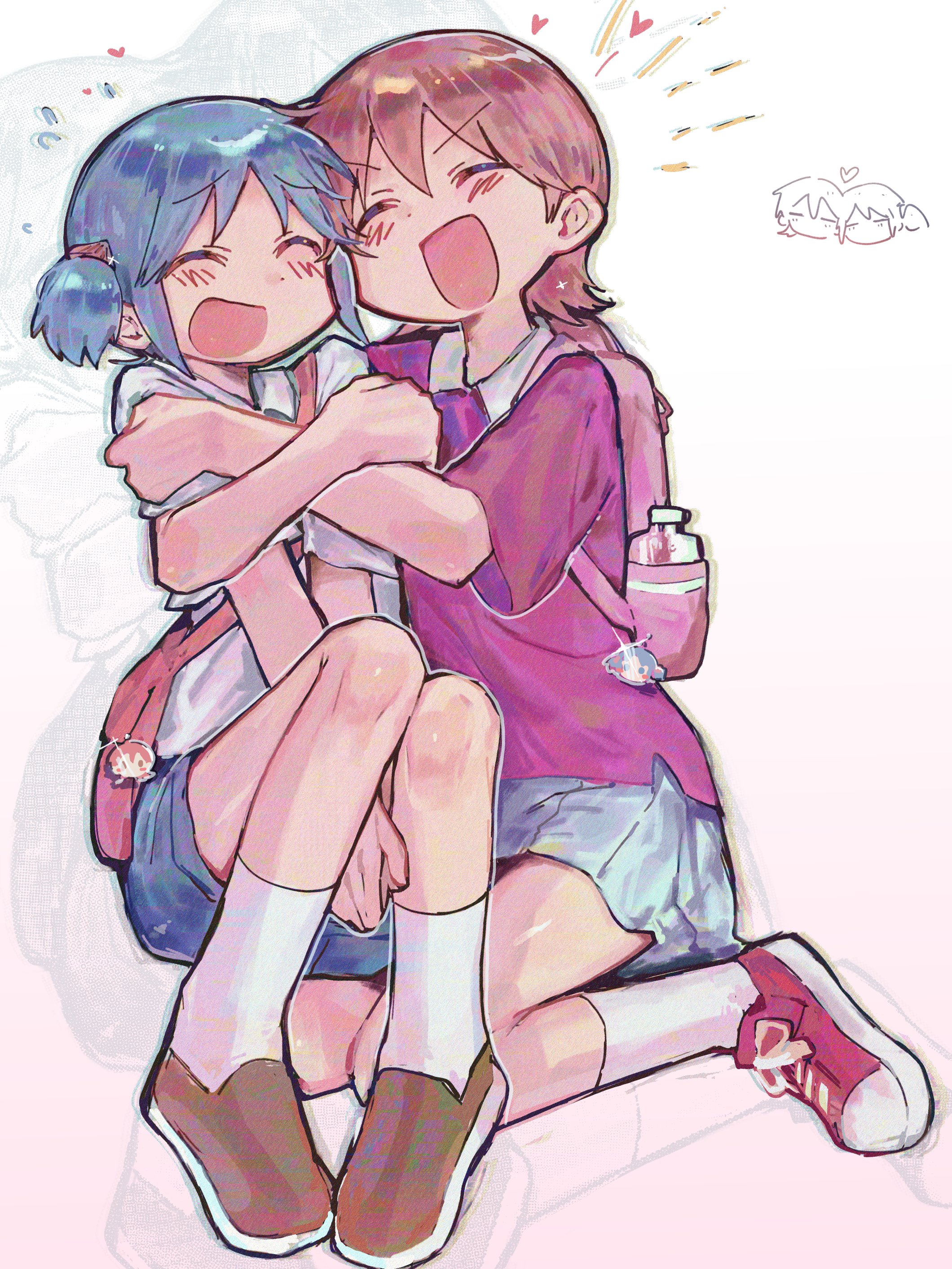 2girls absurdres aioi_yuuko ankle_socks arm_between_legs blue_hair blue_skirt blush bottle brown_hair brown_shoes character_charm charm_(object) chibi closed_eyes collared_shirt cube_hair_ornament flying_sweatdrops hair_between_eyes hair_ornament heart highres hug hug_from_side kneeling loafers medium_hair multiple_girls naganohara_mio nichijou open_mouth own_hands_together parted_bangs pink_bag pleated_skirt projected_inset red_bag red_shoes shirt shoes short_hair short_twintails sidelocks skirt smile sneakers socks sparkle twintails water_bottle white_skirt yiran1224 zoom_layer