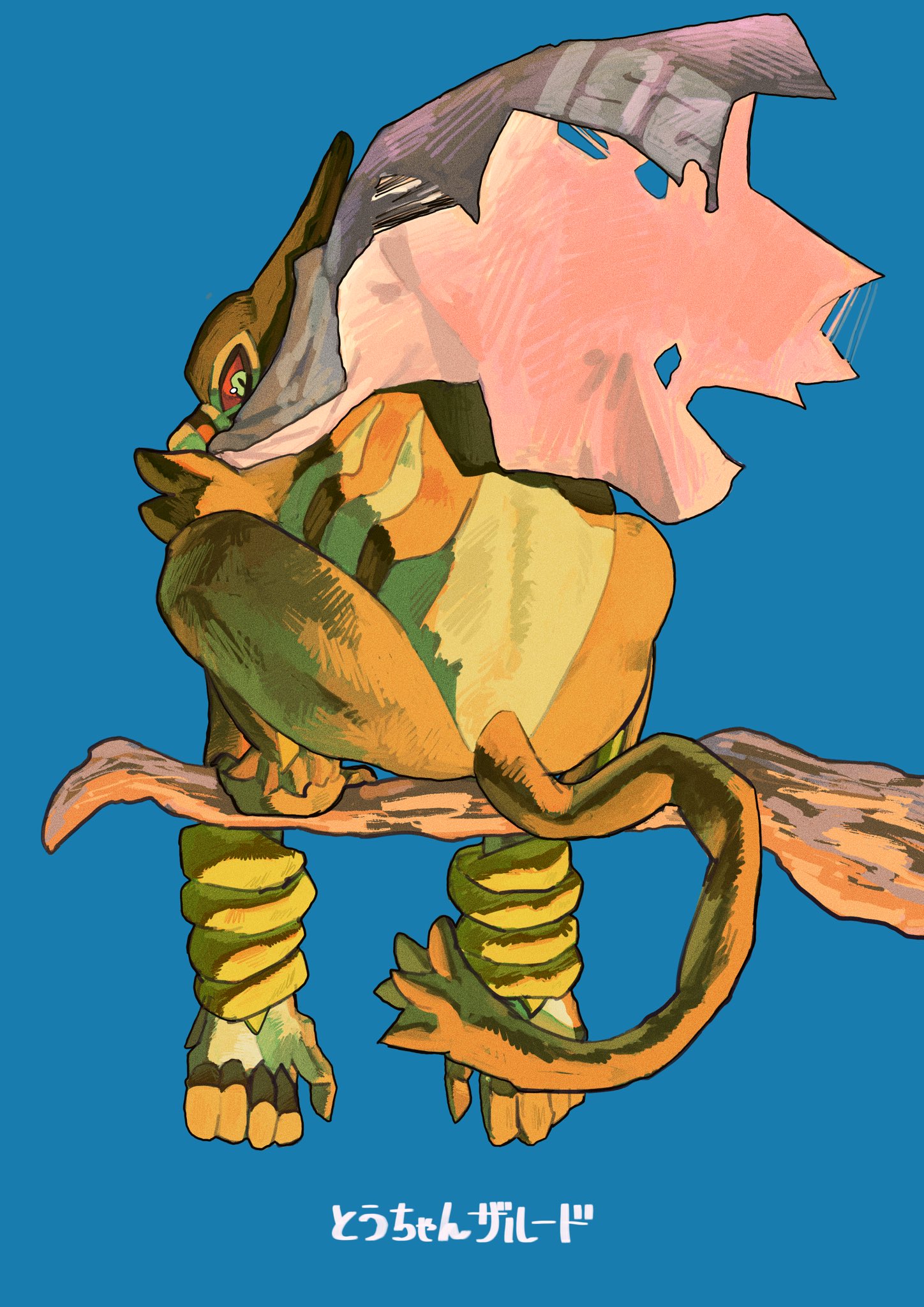 blue_background branch character_name clothed_pokemon colored_sclera full_body gen_8_pokemon highres looking_at_viewer monkey mythical_pokemon nintendo no_humans ookiitora128706 pokemon pokemon_(creature) pokemon_focus purple_scarf red_eyes red_sclera scarf simple_background solo tail torn_clothes torn_scarf zarude zarude_(dada)