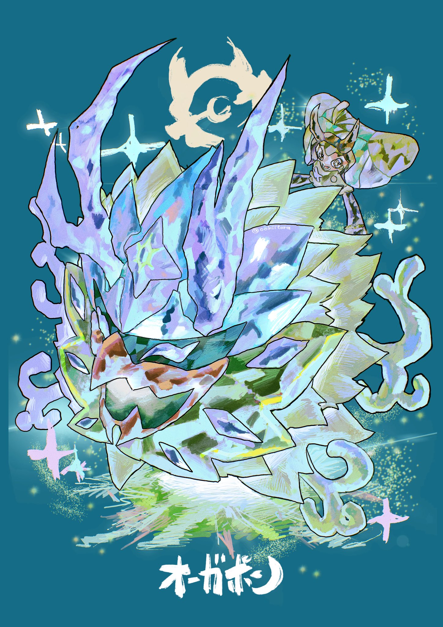 blue_background character_name colored_sclera colored_skin crystal fangs full_body highres mask nintendo no_humans ogerpon ookiitora128706 open_mouth orange_skin pokemon pokemon_(creature) pokemon_focus simple_background solo sparkle star-shaped_pupils star_(symbol) symbol-shaped_pupils terastallization twitter_username yellow_eyes