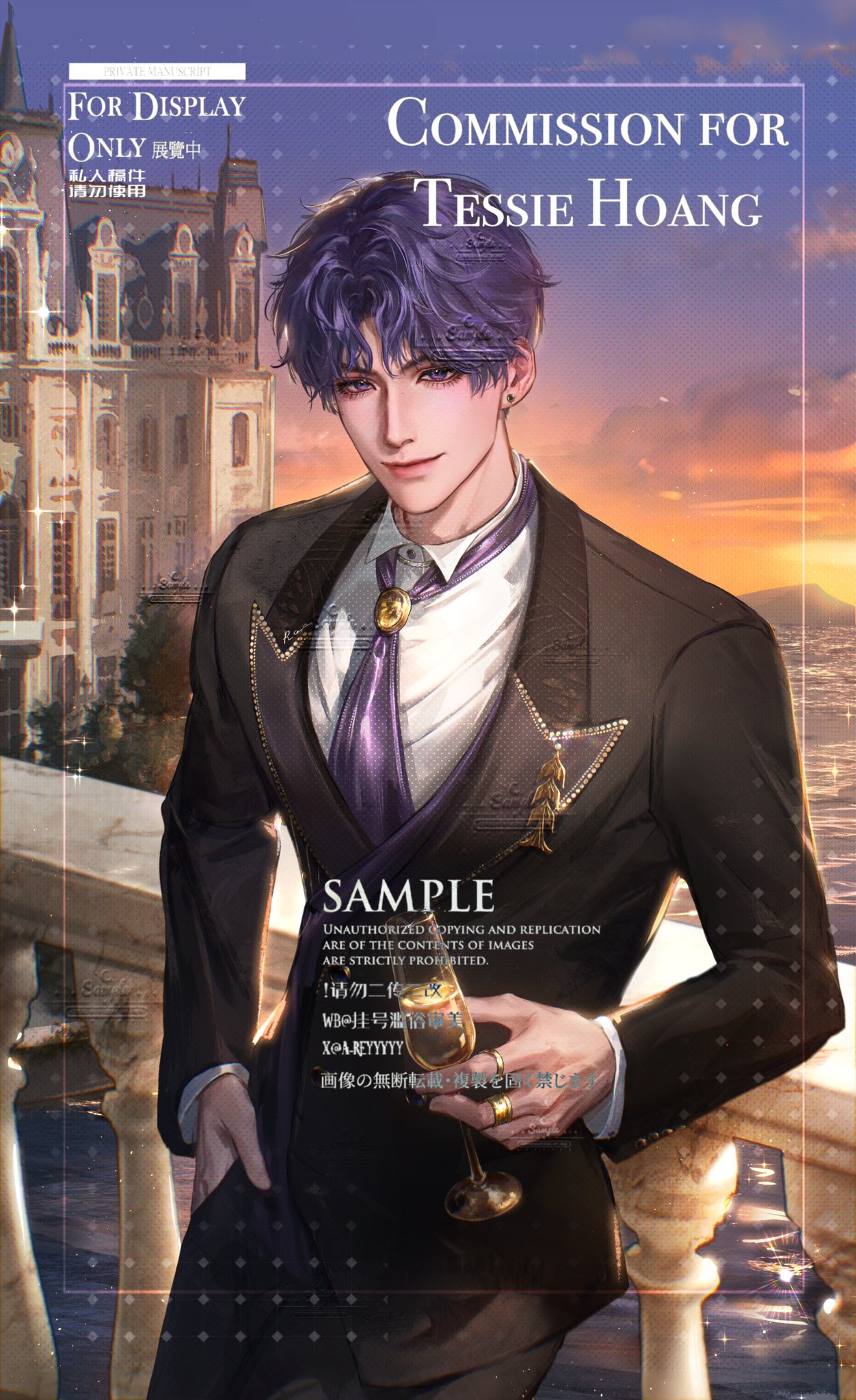 1boy black_jacket black_pants blazer chinese_commentary closed_mouth commentary_request commission cup drinking_glass earrings guahao_lansu_shenmei hand_in_pocket highres holding holding_cup jacket jewelry lapels long_sleeves looking_at_viewer love_and_deepspace male_focus necktie ocean pants peaked_lapels purple_eyes purple_hair purple_necktie rafayel_(love_and_deepspace) ring short_hair sky smile solo twitter_username watermark weibo_username