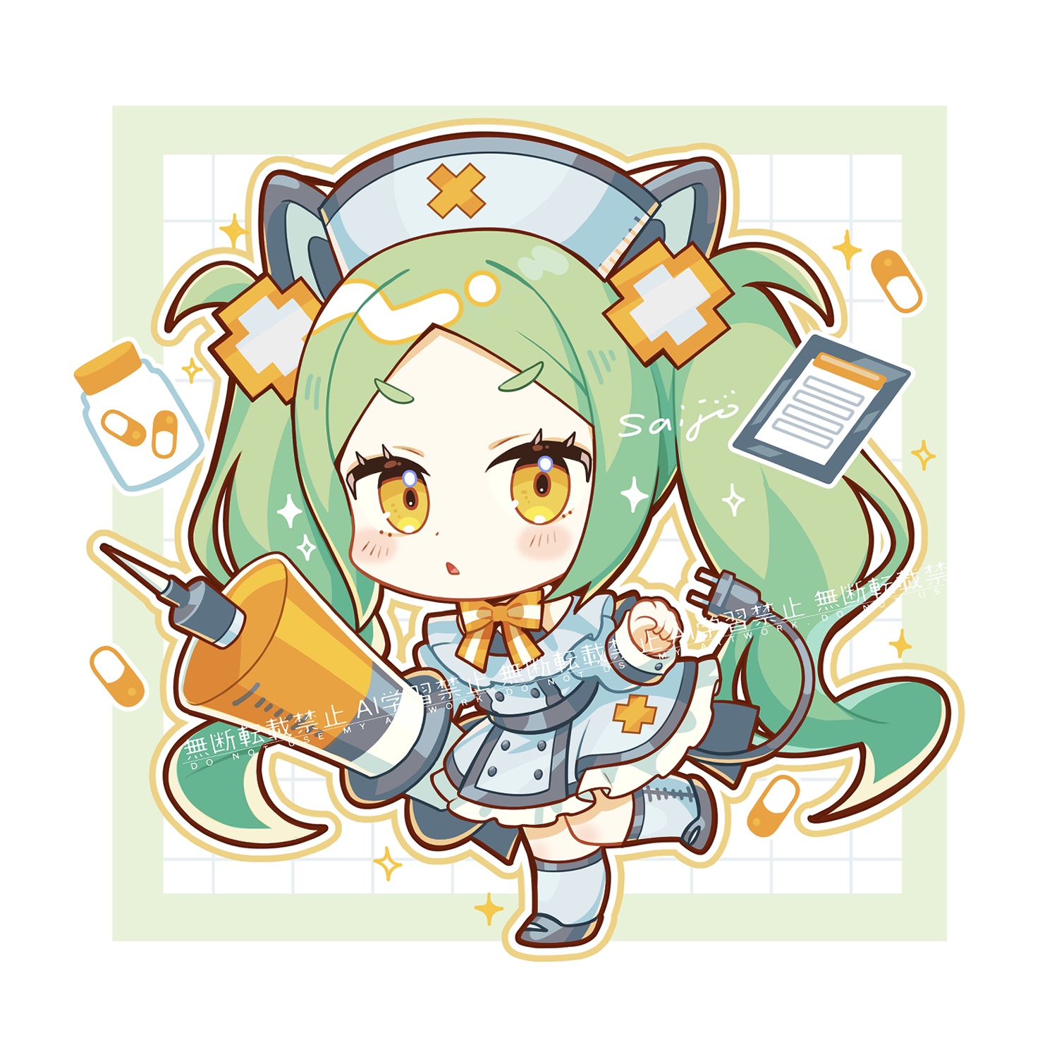 1girl black_shoes blue_hat blush bow bowtie chibi chibi_only commentary dot_nose dress frilled_sleeves frills full_body grey_socks hat highres holding holding_syringe kneehighs long_hair long_sleeves looking_at_viewer open_mouth orange_bow orange_bowtie original outline parted_bangs pill saijo1201 shoes sidelocks signature socks solo sparkle standing standing_on_one_leg striped_bow striped_bowtie striped_clothes syringe thick_eyebrows twintails very_long_hair watermark white_background white_dress yellow_eyes
