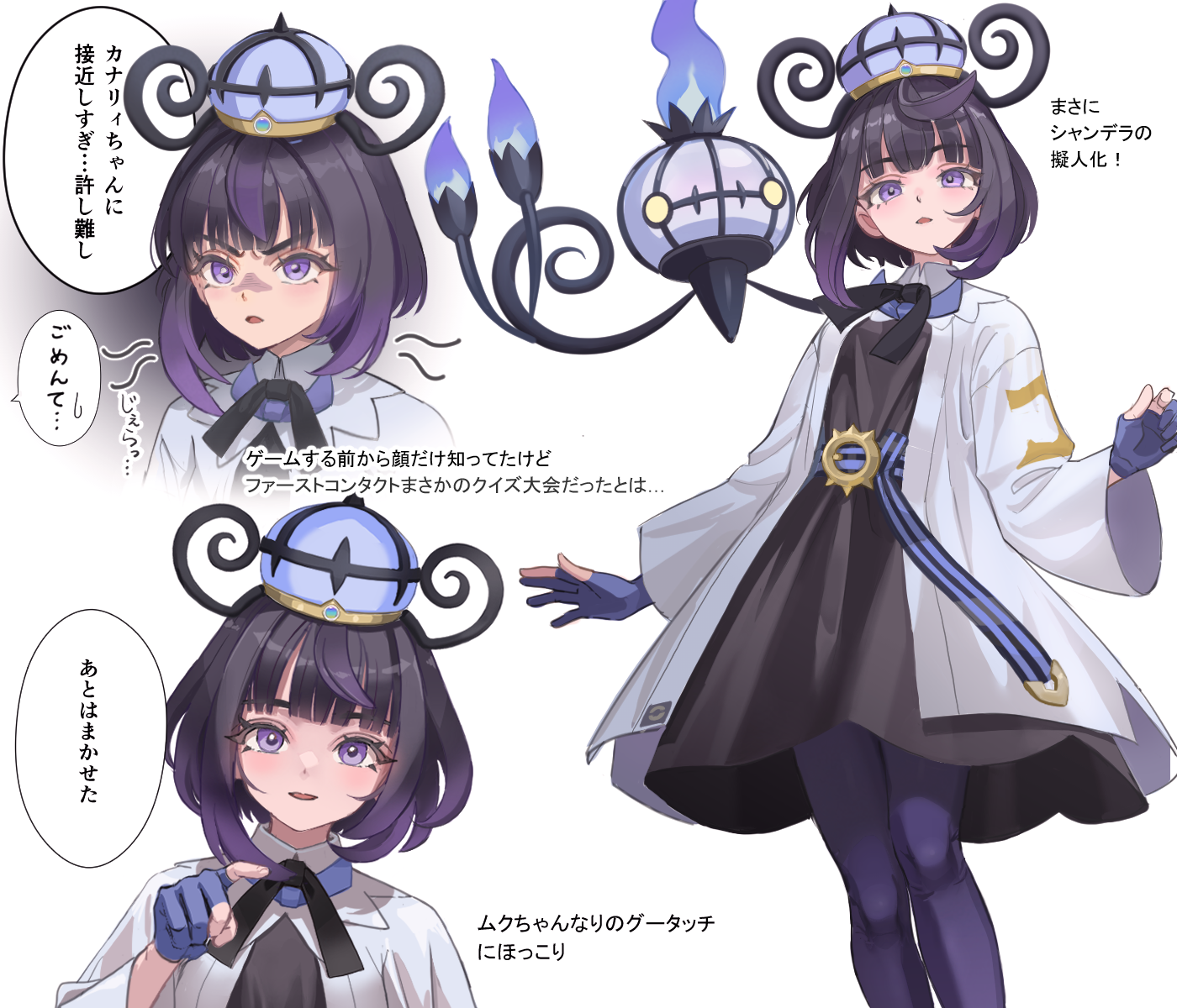 1girl belt belt_around_waist black_dress black_hair blue_fire blue_gloves blunt_bangs chandelure coat commentary_request dress eyelashes fire gen_5_pokemon gloves gwynn_(pokemon) hat highres horizontal-striped_belt knees long_sleeves looking_at_viewer medium_hair mitama_(mokochiko) multiple_views nintendo open_clothes open_coat open_mouth pantyhose partially_fingerless_gloves pointing pokemon pokemon_(creature) pokemon_legends:_z-a speech_bubble translation_request white_background white_coat