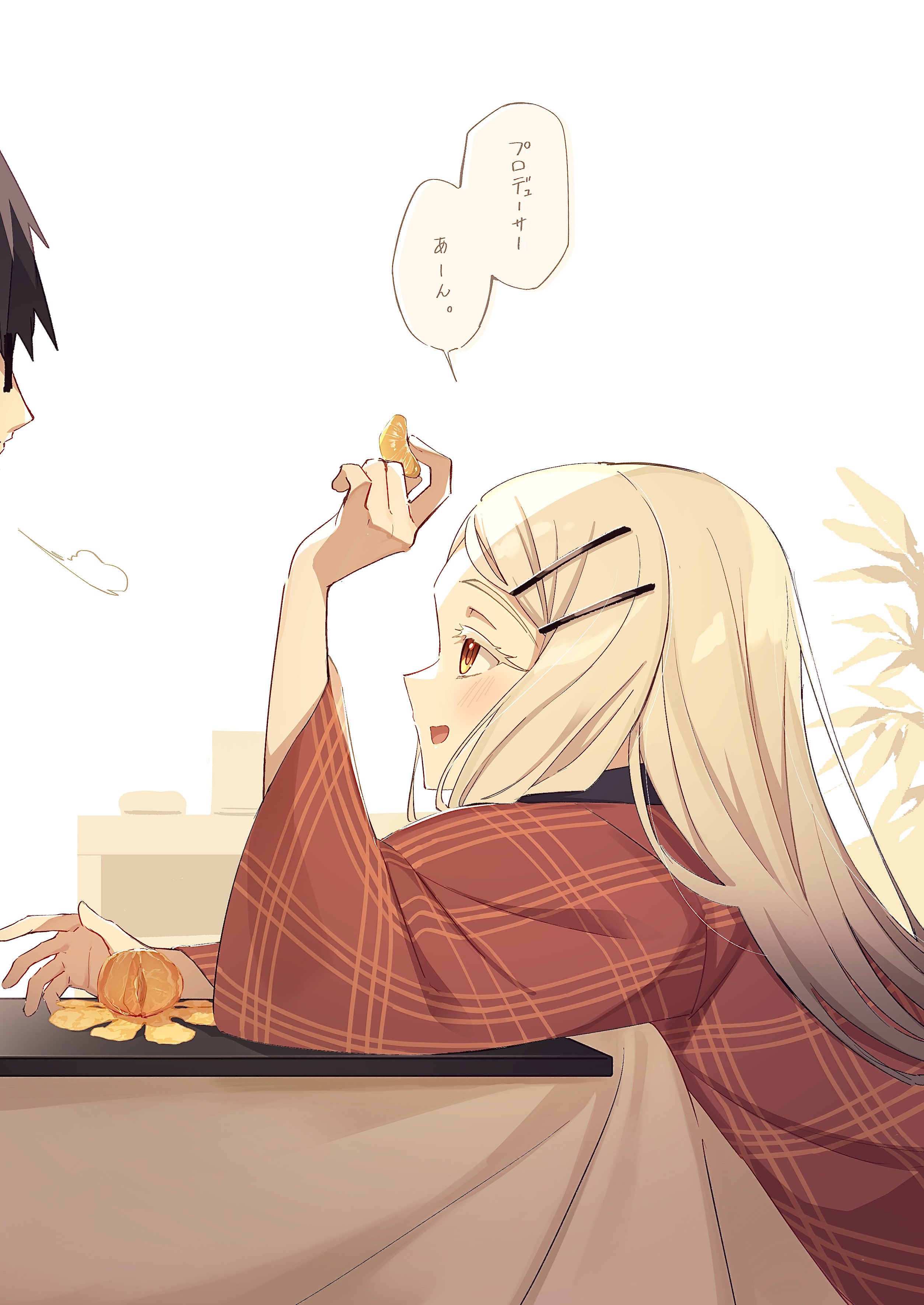 1boy 1girl absurdres blonde_hair colored_eyelashes food from_side fruit gakuen_idolmaster hair_ornament hairclip hand_up hanten_(clothes) highres holding holding_food holding_fruit idolmaster indoors jacket kotatsu long_hair looking_at_viewer looking_up mandarin_orange open_mouth orange_eyes out_of_frame parallel_hairclips parted_bangs producer_(idolmaster) profile puff_of_air red_jacket shinosawa_hiro sitting solo_focus speech_bubble table tamago_sando translation_request under_kotatsu under_table white_background wide_sleeves