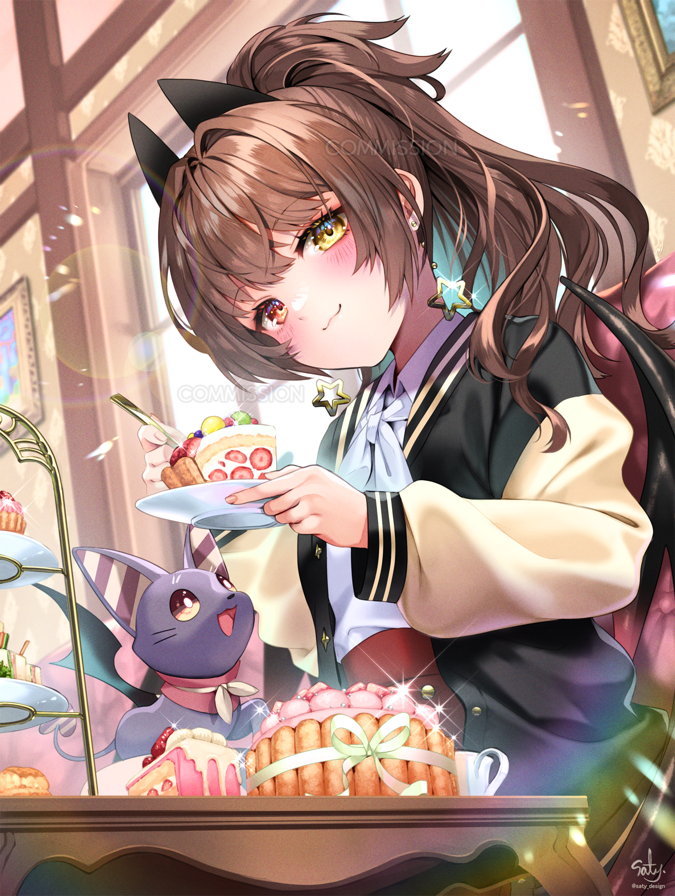 1girl blush borrowed_character brown_hair cake closed_mouth commentary commission earrings food hair_intakes heterochromia highres holding holding_plate jewelry long_hair long_sleeves looking_at_viewer original plate ponytail red_eyes sitting skeb_commission star_(symbol) star_earrings sweets symbol-only_commentary tiered_tray yellow_eyes yukimichi_(nieko)