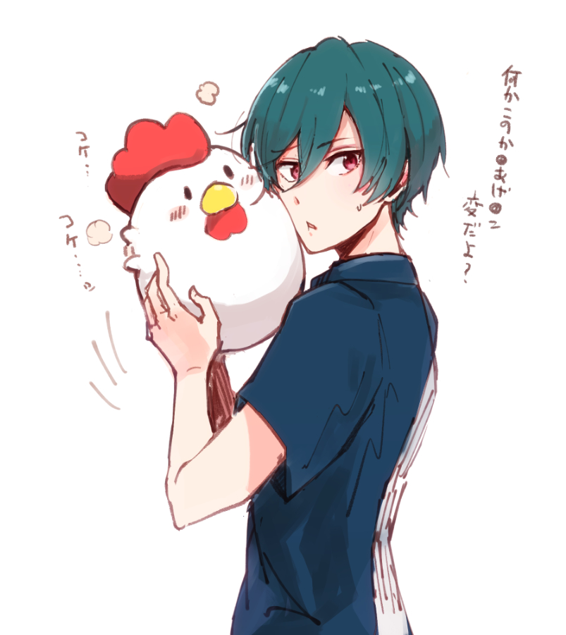 1boy commentary_request double-parted_bangs facing_viewer free! green_hair hair_between_eyes hands_up holding holding_stuffed_toy kirishima_ikuya male_focus parted_lips pink_eyes rayu short_hair short_sleeves sideways_glance simple_background solo stuffed_animal stuffed_chicken stuffed_toy translation_request upper_body white_background