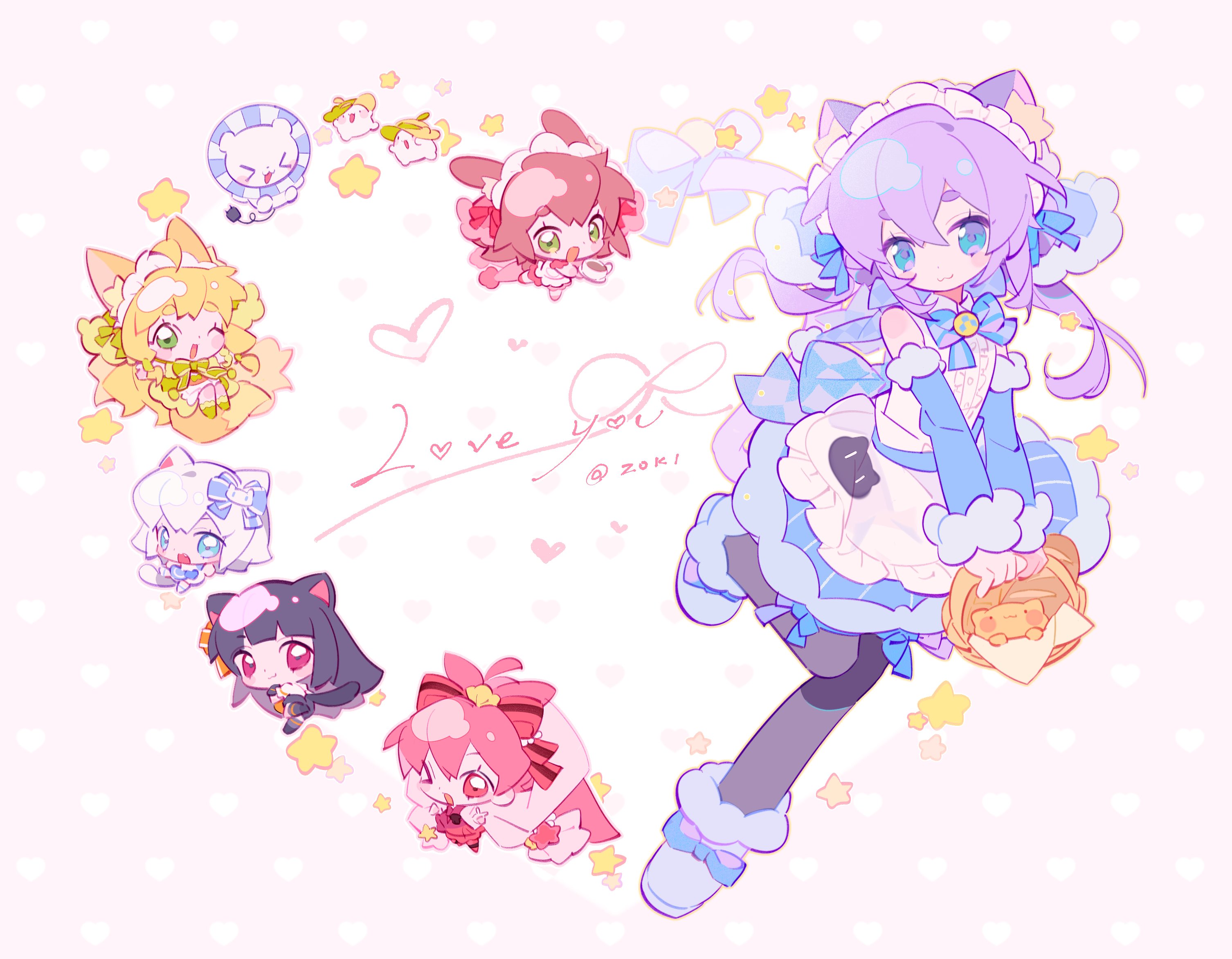 >_o 6+girls :3 :d ;d animal_ear_fluff animal_ears bare_shoulders black_hair black_pantyhose blonde_hair blue_boots blue_bow blue_bowtie blue_eyes blue_skirt blue_sleeves blush_stickers boots bow bowtie brown_hair cat_ears cat_girl cat_tail character_request chibi closed_mouth collared_shirt commentary copyright_request detached_sleeves double-parted_bangs footwear_bow full_body fur-trimmed_boots fur-trimmed_sleeves fur_trim hair_between_eyes hair_bow highres leg_up long_hair long_sleeves looking_at_viewer multiple_girls one_eye_closed open_mouth pantyhose pink_background polka_dot polka_dot_background purple_hair red_bow shirt short_hair skirt sleeveless sleeveless_shirt smile striped_bow striped_bowtie striped_clothes striped_skirt symbol-only_commentary tail vertical-striped_clothes vertical-striped_skirt white_hair white_shirt zoookiiiii