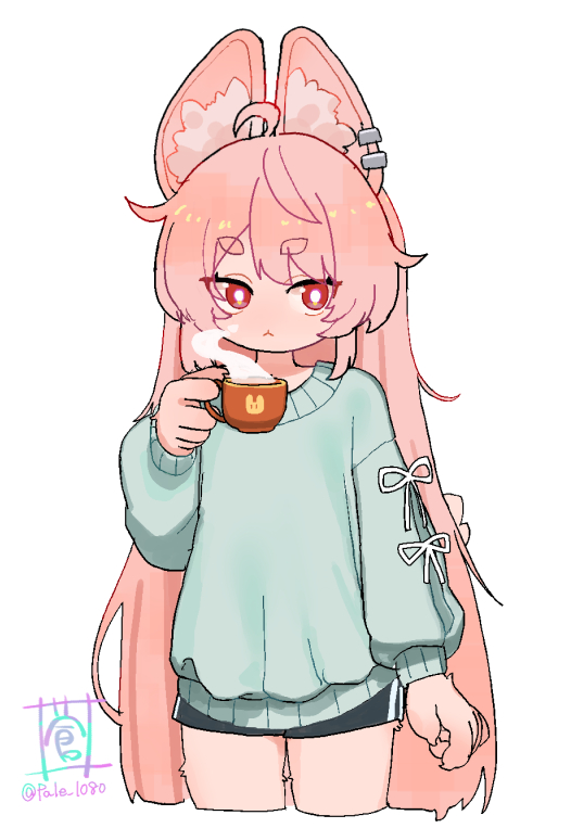 1girl :< ahoge alternate_costume animal_ear_fluff animal_ear_piercing animal_ears black_shorts bright_pupils closed_mouth commentary_request cowboy_shot cup furry furry_female green_sweater holding holding_cup long_hair looking_to_the_side pink_fur pink_hair rabbit_ears rabbit_girl red_eyes short_eyebrows shorts simple_background solo sou_(pale_1080) steam sweater thick_eyebrows twitter_username white_background white_pupils zenless_zone_zero zhao_(zenless_zone_zero)