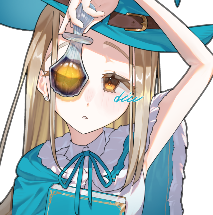 1girl aqua_capelet aqua_hat aqua_ribbon arm_up armpits belt_buckle blonde_hair blush book buckle capelet collared_shirt commentary_request dim_crescendo earrings eyelashes flask fur-trimmed_capelet fur_trim gakuen_idolmaster hat hat_belt holding holding_book holding_flask idolmaster jewelry liquid long_hair looking_at_viewer neck_ribbon nose_blush one_eye_covered orange_eyes parted_lips ribbon shinosawa_hiro shirt signature sleeveless sleeveless_shirt solo stud_earrings upper_body watermark white_shirt witch_hat