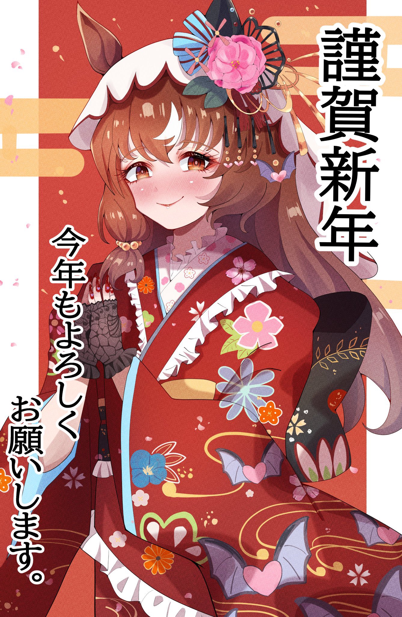 1girl animal_ears black_gloves blush brown_hair closed_mouth commentary_request ear_covers ear_flower floral_print floral_print_kimono gloves hair_between_eyes heart highres horse_ears horse_girl japanese_clothes kimono long_hair long_sleeves looking_at_viewer nengajou new_year obi own_hands_clasped own_hands_together print_kimono red_eyes red_kimono red_nails sash single_ear_cover smile solo souken_bicha still_in_love_(umamusume) umamusume veil white_streaks white_veil wide_sleeves wing_print wings