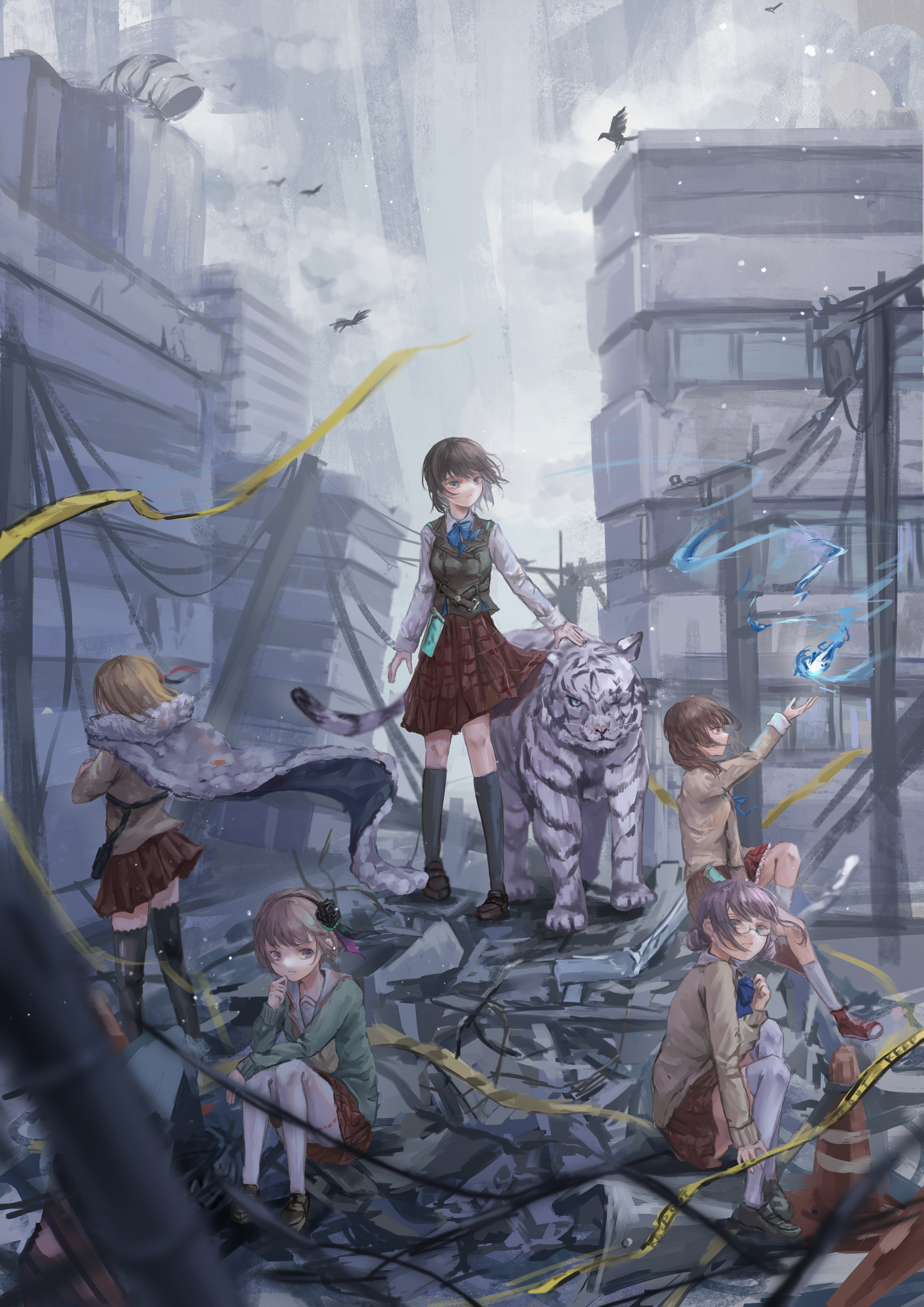 1other 5girls absurdres aoi_erika bird black_hair blonde_hair brown_hair building byakko_(heaven_burns_red) caution_tape commentary_request grey_hair heaven_burns_red highres higuchi_seika hiiragi_kozue minase_ichigo minase_sumomo multiple_girls purple_hair rubble ruins sanou school_uniform sitting skirt socks tiger traffic_cone white_tiger