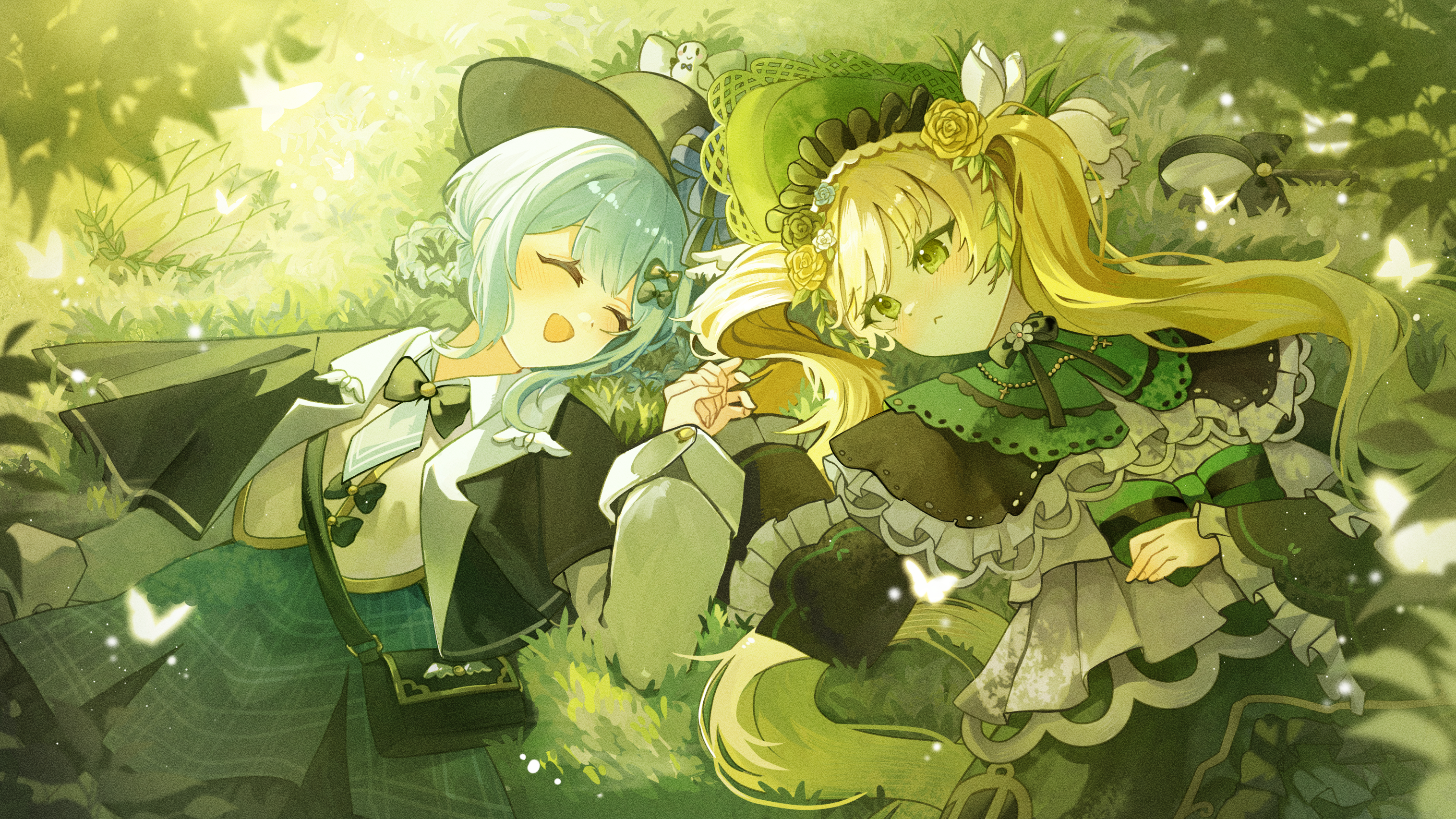 2girls :< :d bird_hat_ornament black_bag black_capelet black_flower black_hat black_rose blonde_hair blue_flower blue_hair blue_rose blue_skirt bonnet braid braided_hair_rings bug butterfly capelet commentary deerstalker detective dress flower green_bonnet green_dress green_hair hair_rings hat highres holding_hands insect looking_at_another magnifying_glass mahou_shoujo_no_majo_saiban multiple_girls on_grass open_mouth plaid_clothes plaid_skirt rose siocm skirt smile symbol-only_commentary tachibana_sherry tono_hanna twintails yellow_flower yellow_rose yuri