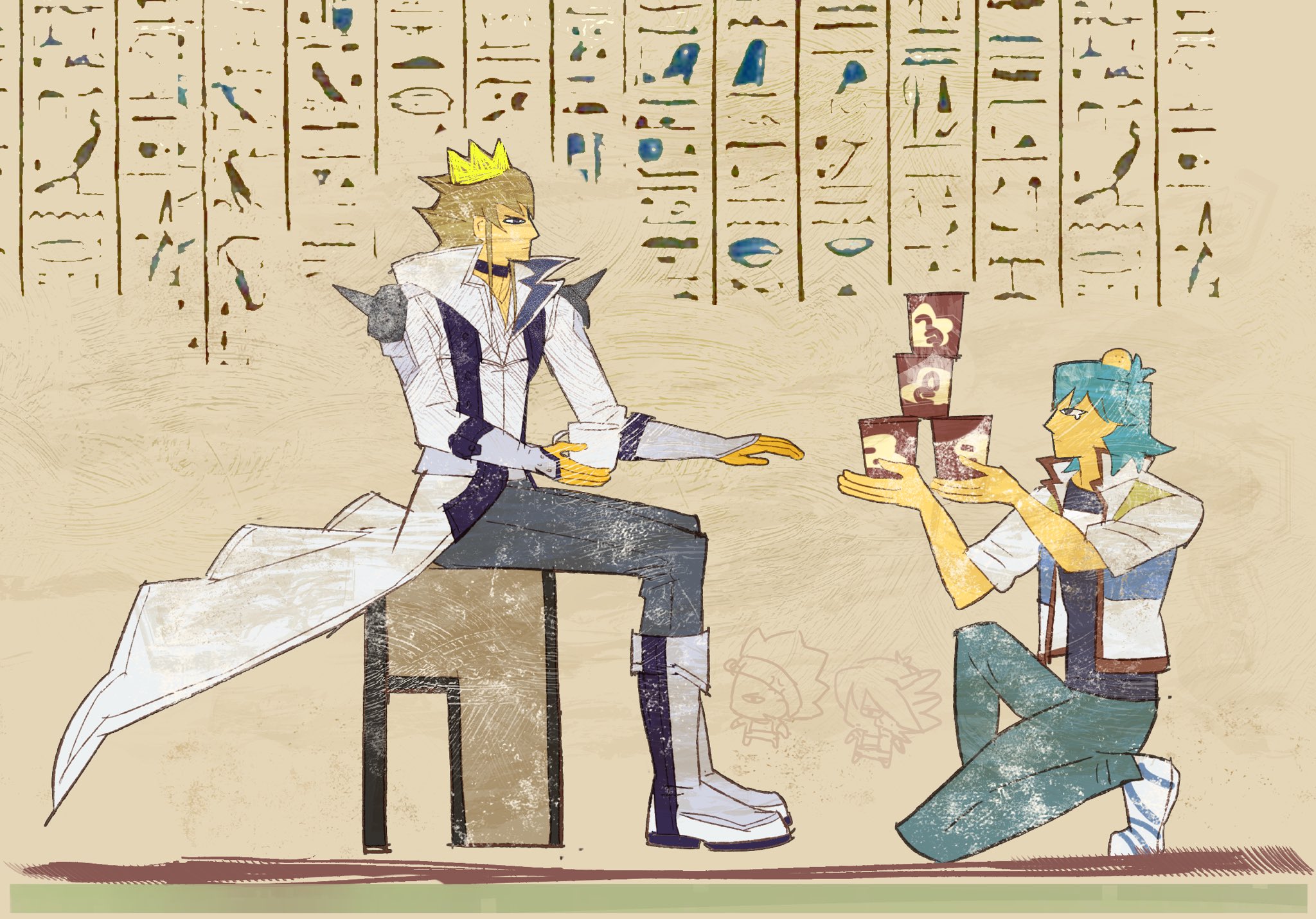 2boys 99ki5 ancient_egyptian blonde_hair blue_hair blue_pants boots bruno_(yu-gi-oh!) coat crown hashtag-only_commentary highres instant_cup_noodles instant_noodles jack_atlas jacket kneeling male_focus multiple_boys open_clothes open_jacket pants sitting white_boots white_coat white_jacket yu-gi-oh! yu-gi-oh!_5d's