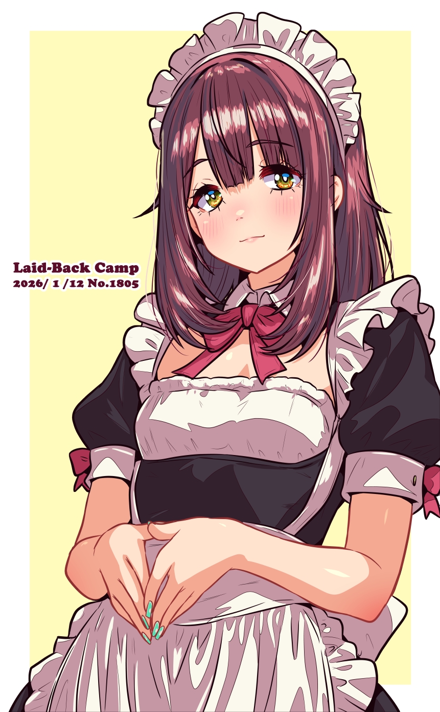 1girl alternate_costume breasts brown_hair commentary_request enmaided highres jagi_(jagi_souken) long_hair maid maid_headdress simple_background small_breasts solo steepled_fingers toki_ayano yellow_eyes yurucamp