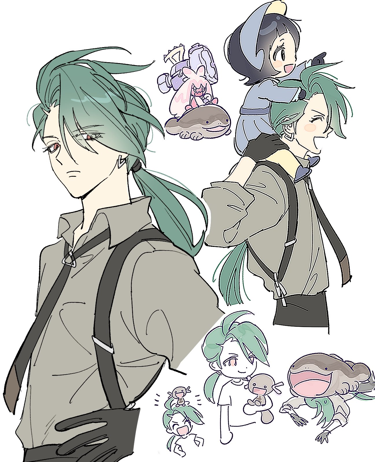 ._. 2girls ahoge androgynous arched_bangs black_gloves black_hair black_necktie black_pants blush_stickers bonnet clodsire closed_eyes closed_mouth collared_shirt colored_skin commentary_request dress earrings gloves green_hair grey_bonnet grey_dress grey_pupils grey_shoes hammer highres holding holding_hammer jewelry long_hair long_sleeves looking_at_viewer low-tied_long_hair multiple_girls necktie nintendo open_mouth pants pantyhose pink_hair pink_skin pkmnrkgk pokemon pokemon_(creature) pokemon_sv ponytail poppy_(pokemon) red_eyes reverse_trap riding riding_pokemon rika_(pokemon) shirt shoes short_hair simple_background smile standing suspenders tinkaton triangle_earrings white_background yellow_pantyhose