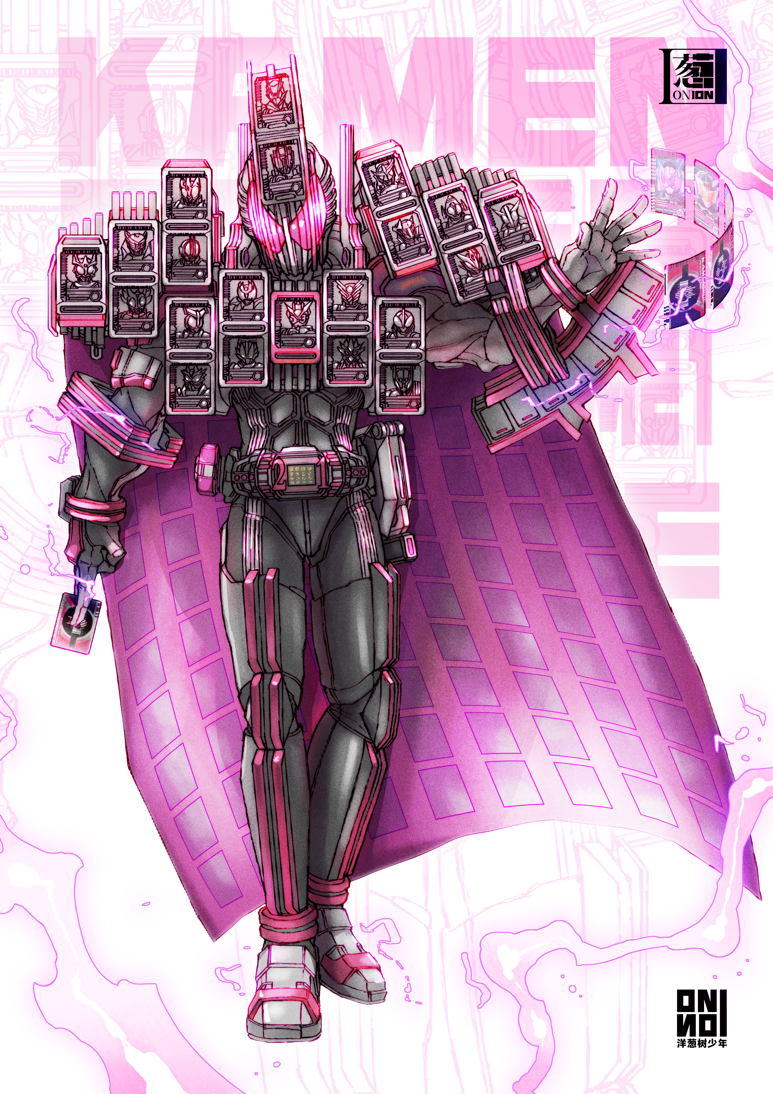 1boy absurdres armor artist_logo artist_name cape card character_name commentary_request decadriver duel_disk facing_viewer full_armor full_body highres holding holding_card holographic_interface kamen_rider kamen_rider_agito kamen_rider_blade kamen_rider_build kamen_rider_dcd kamen_rider_decade kamen_rider_decade_complete_form21 kamen_rider_den-o kamen_rider_double kamen_rider_drive kamen_rider_ex-aid kamen_rider_faiz kamen_rider_fourze kamen_rider_gaim kamen_rider_ghost kamen_rider_hibiki kamen_rider_kabuto kamen_rider_kiva kamen_rider_kuuga kamen_rider_ooo kamen_rider_ryuki kamen_rider_wizard kamen_rider_zero-one kamen_rider_zi-o logo male_focus pink_cape standing tokusatsu yangcongshu_shaonian yu-gi-oh!
