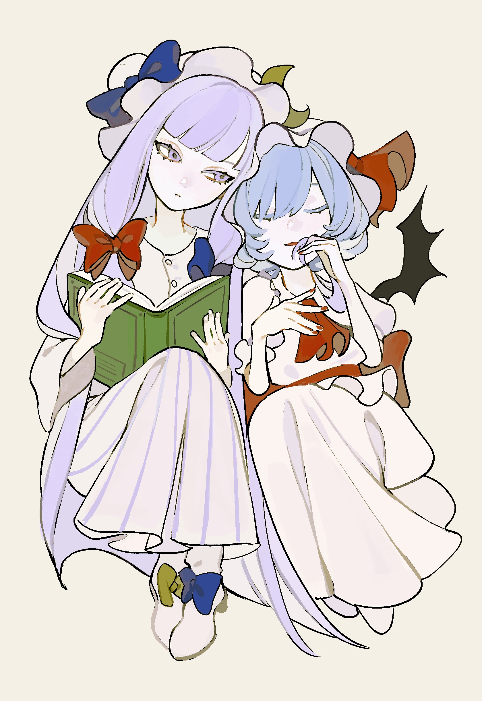 2girls absurdres ascot bat_wings blue_hair blunt_bangs book bow commentary_request crescent crescent_hair_ornament crescent_hat_ornament crescent_pin dee_(tannsumi) dress hair_bow hair_ornament hair_ribbon hat hat_ornament high_heels highres long_hair mob_cap multiple_girls patchouli_knowledge purple_eyes purple_hair red_ascot red_sash remilia_scarlet ribbon sash short_hair sidelocks simple_background smile striped_clothes striped_dress touhou vertical-striped_clothes vertical-striped_dress white_dress wings