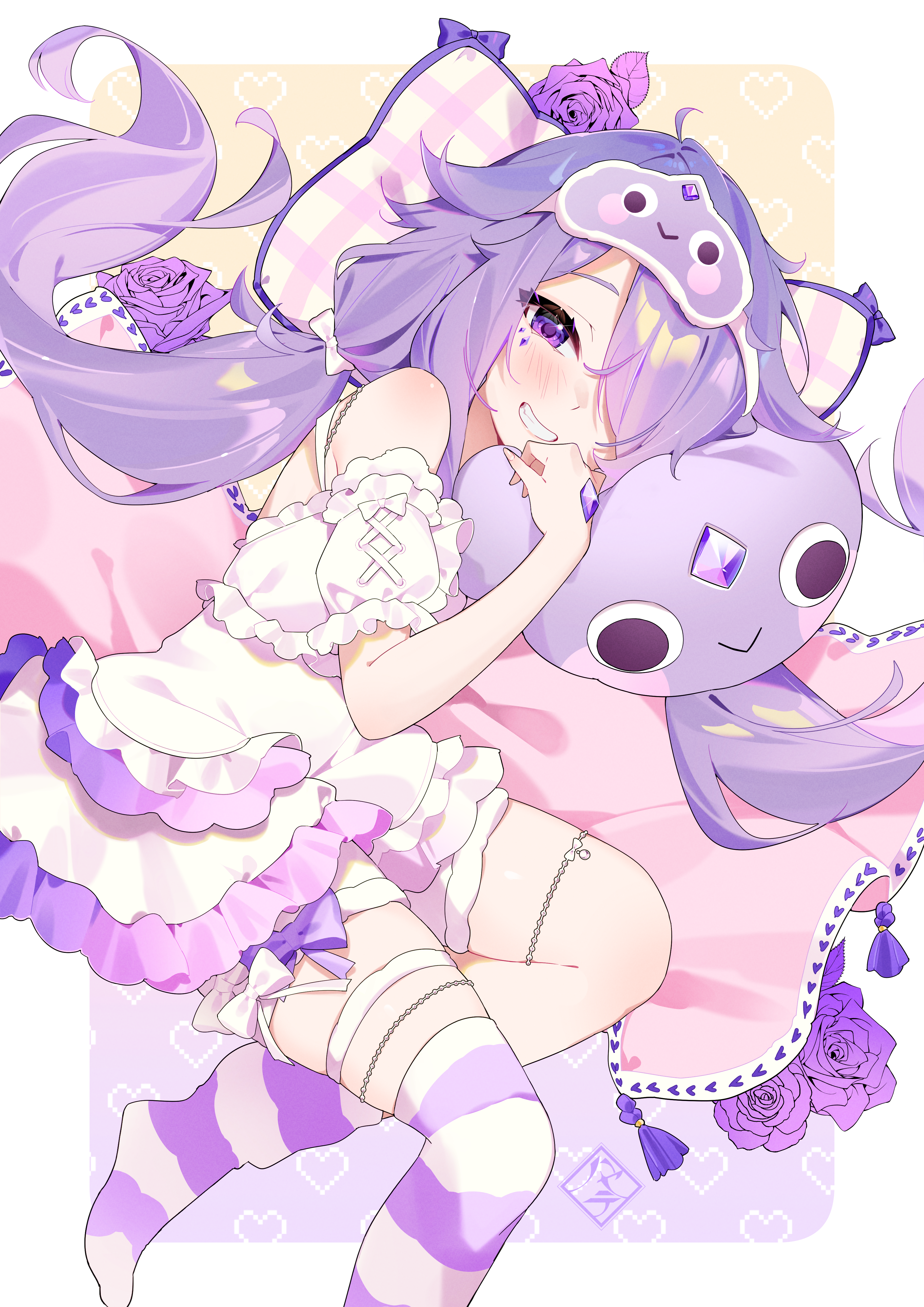 1girl absurdres asymmetrical_legwear chemise commentary detached_sleeves english_commentary grin hair_over_one_eye hayate_fish head_on_pillow highres hololive hololive_english jewelry koseki_bijou koseki_bijou_(pebble_pajamas) long_bangs long_hair looking_at_viewer low_twintails lying mask mask_on_head no_shoes official_alternate_costume on_side pebble pillow puffy_detached_sleeves puffy_short_sleeves puffy_sleeves purple_eyes purple_hair purple_socks purple_thighhighs short_shorts short_sleeves shorts sleep_mask smile socks solo striped_clothes striped_socks striped_thighhighs thighhighs thighlet twintails uneven_legwear very_long_hair virtual_youtuber white_chemise white_shorts white_socks white_thighhighs