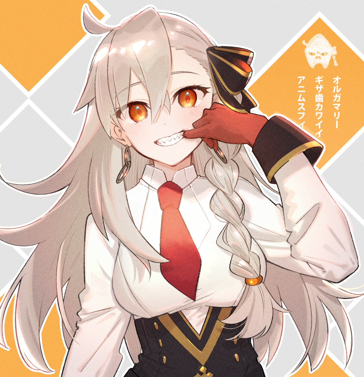 1girl asymmetrical_bangs black_skirt blush breasts collared_shirt commentary_request earrings fate/grand_order fate_(series) gloves grey_hair grin hair_ribbon high-waist_skirt highres hoop_earrings horns jewelry large_breasts long_hair long_sleeves looking_at_viewer necktie olga_marie_animusphere olga_marie_animusphere_(unbeast) orange_eyes pencil_skirt red_gloves ribbon sharp_teeth shirt single_horn skirt smile solo teeth translated uninu very_long_hair white_shirt