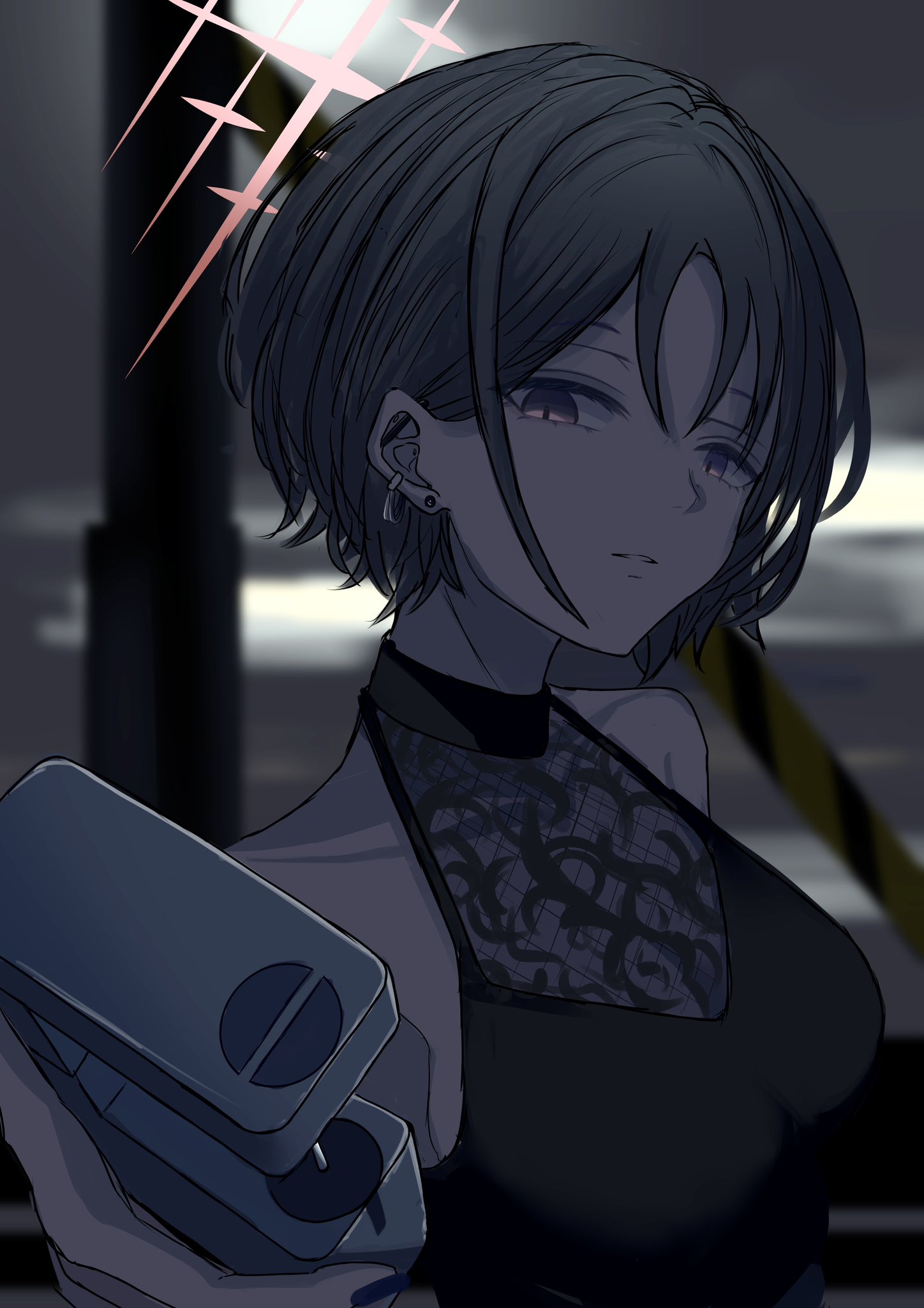 1girl aka_afl_o barbell_piercing bare_shoulders black_hair black_shirt blue_archive blurry blurry_background breasts commentary_request ear_piercing ear_piercing_gun halo halterneck highres holding_tool incoming_object industrial_piercing looking_at_viewer medium_breasts misaki_(blue_archive) parted_lips piercing portrait red_halo shirt short_hair solo