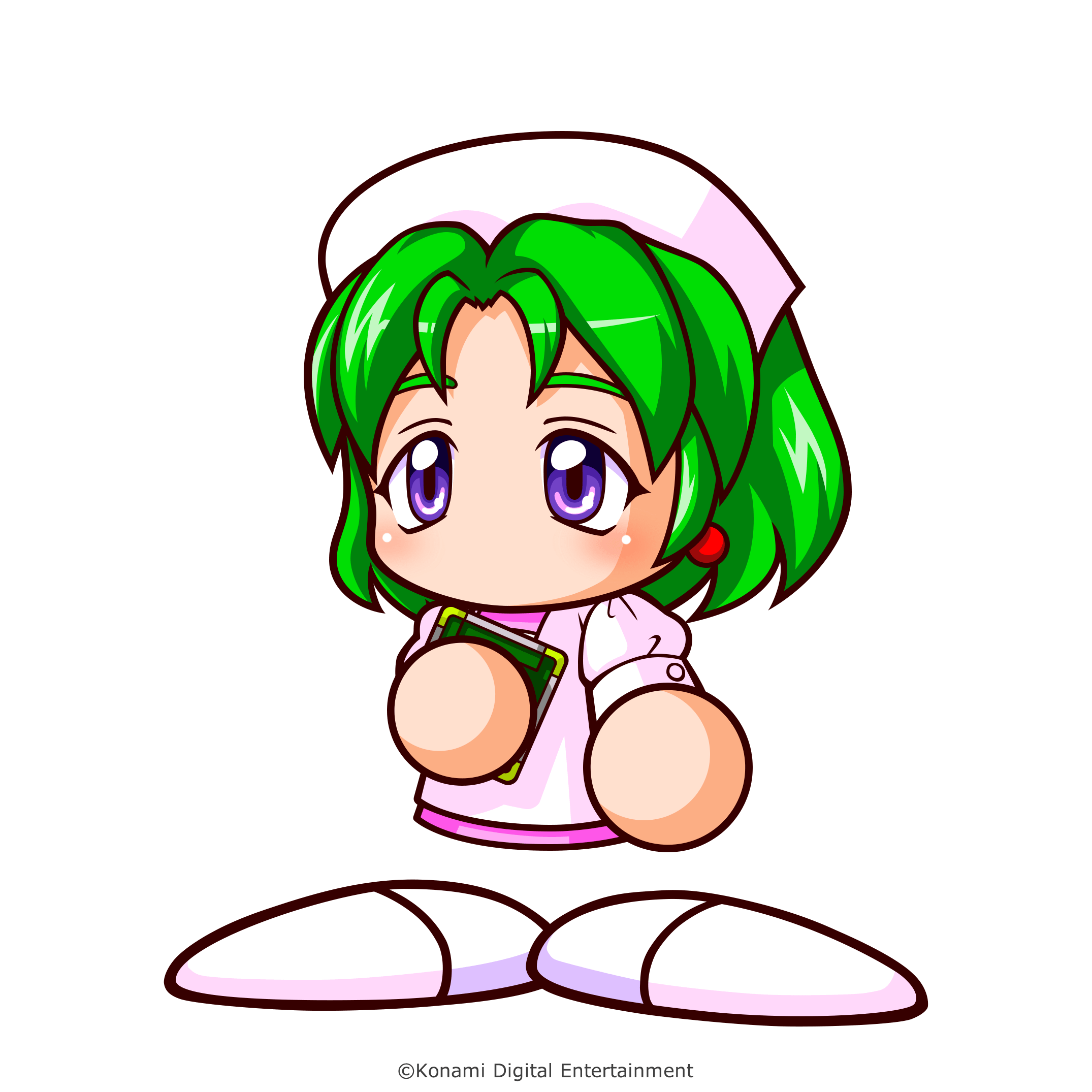 1girl artist_request clipboard copyright_notice earrings green_hair hat highres holding holding_clipboard jewelry jikkyou_powerful_pro_yakyuu jikkyou_powerful_pro_yakyuu_(style) katou_kyouko medium_hair no_mouth nurse nurse_cap official_art purple_eyes rayman_limbs shoes solo white_shoes