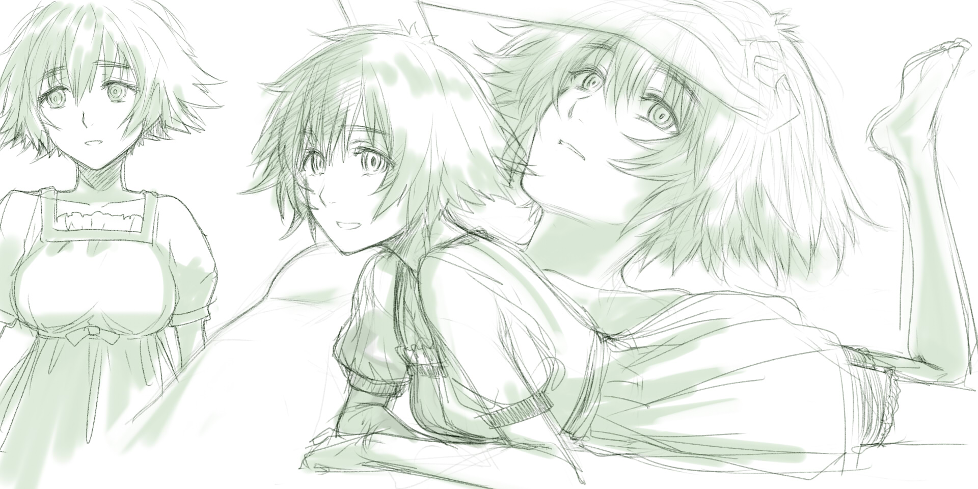 1girl breasts collar commentary_request dress feet_up frilled_collar frills hair_between_eyes highres lying medium_breasts menomorute monochrome multiple_views on_stomach open_mouth science_adventure shiina_mayuri short_hair simple_background sketch smile steins;gate