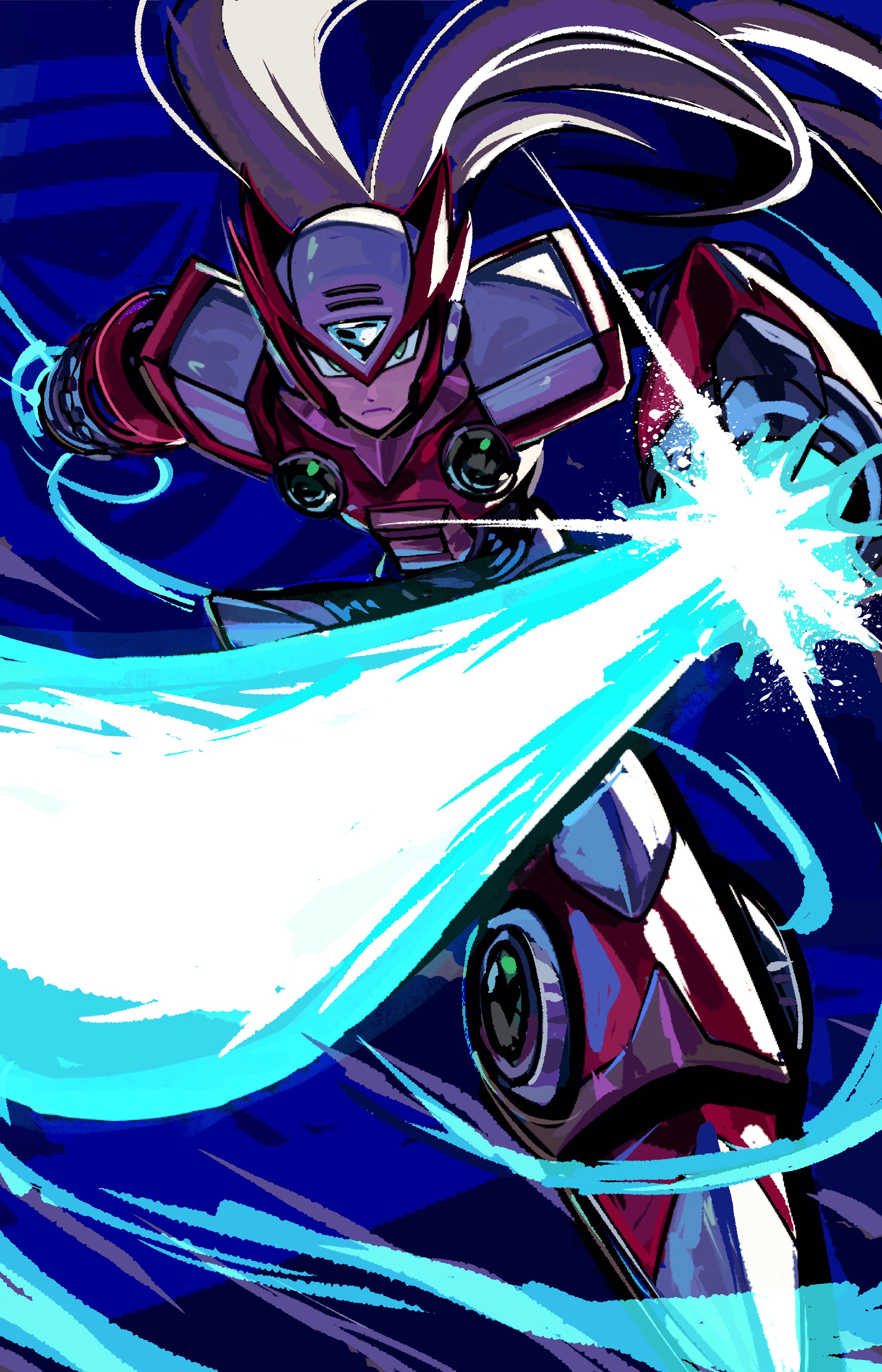 1boy absurdres arm_cannon armor blonde_hair blue_background chest_jewel energy_sword forehead_jewel full_body helmet highres holding holding_sword holding_weapon long_hair male_focus mega_man_(series) mega_man_x_(series) red_armor red_helmet solo spacedawgspace sword weapon z_saber zero_(mega_man)