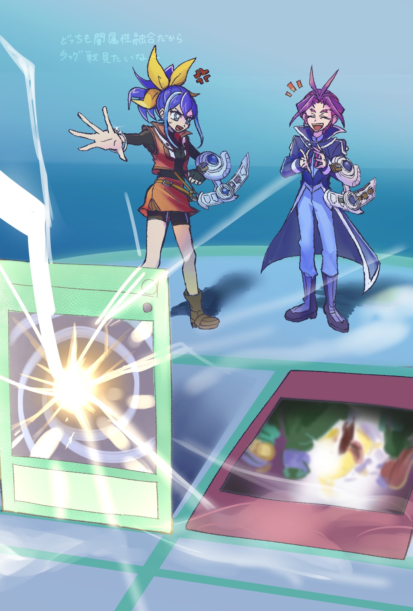 1boy 1girl alternate_costume black_shirt black_shorts blue_background blue_coat blue_hair blue_pants clapping closed_eyes coat commentary_request deck_of_cards dna_surgery duel_academy_uniform_(yu-gi-oh!_gx) duel_disk hair_ribbon high_ponytail highres joeri_(yu-gi-oh!) pants ponytail purple_hair red_skirt red_vest ribbon serena_(yu-gi-oh!) shirt shorts skirt super_polymerization trading_card vest yu-gi-oh! yu-gi-oh!_arc-v yu-gi-oh!_gx zhu_shu