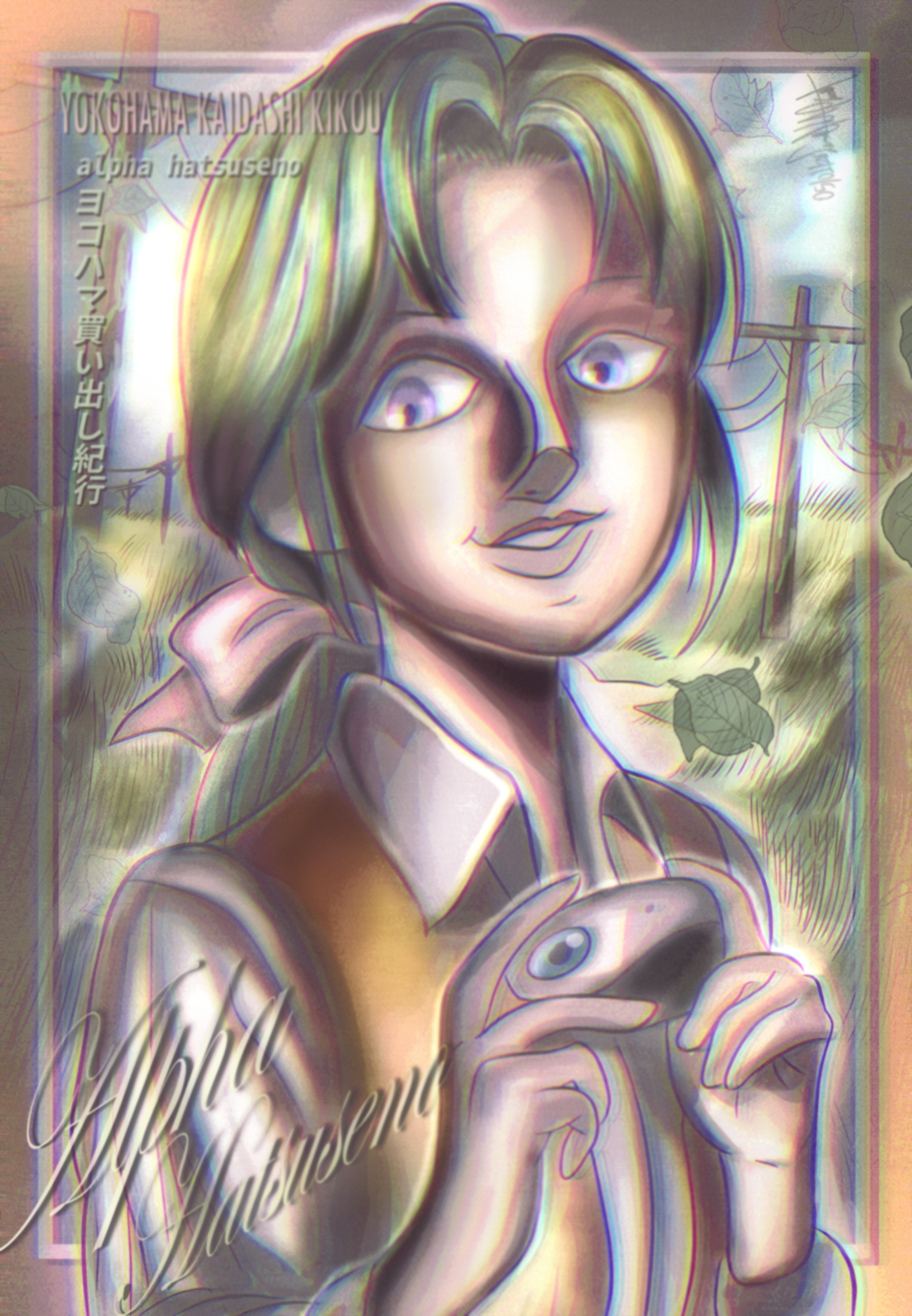 1girl absurdres camera green_eyes hatsuseno_alpha highres holding holding_camera humanoid_robot light_smile lupeco98 nature non-web_source purple_eyes robot self-upload smile yokohama_kaidashi_kikou