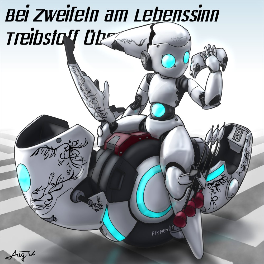 1girl arrow_(projectile) blue_eyes colored_skin commentary_request drossel_von_flugel fireball_(series) german_text hagitsuki_yuu humanoid_robot joints mechanical_hair motor_vehicle no_mouth no_nose robot robot_girl robot_joints solo white_skin