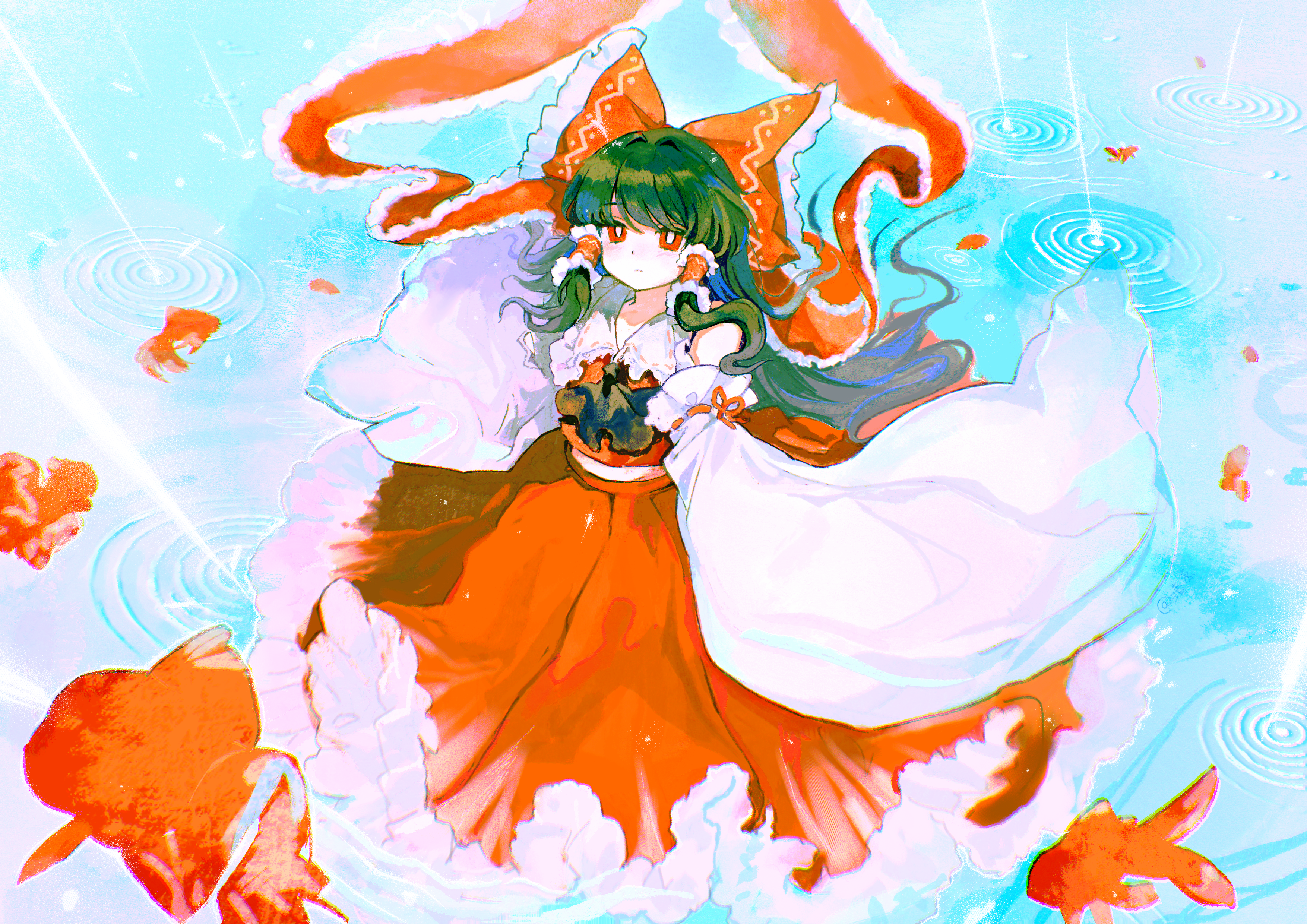 1girl absurdres ascot bow bright_pupils brown_hair closed_mouth detached_sleeves fish frilled_bow frilled_hair_tubes frills goldfish hair_bow hair_tubes hakurei_reimu highres long_hair looking_at_viewer red_bow red_eyes red_skirt ribbon-trimmed_sleeves ribbon_trim ripples seiryo0425 skirt skirt_set solo touhou water white_pupils