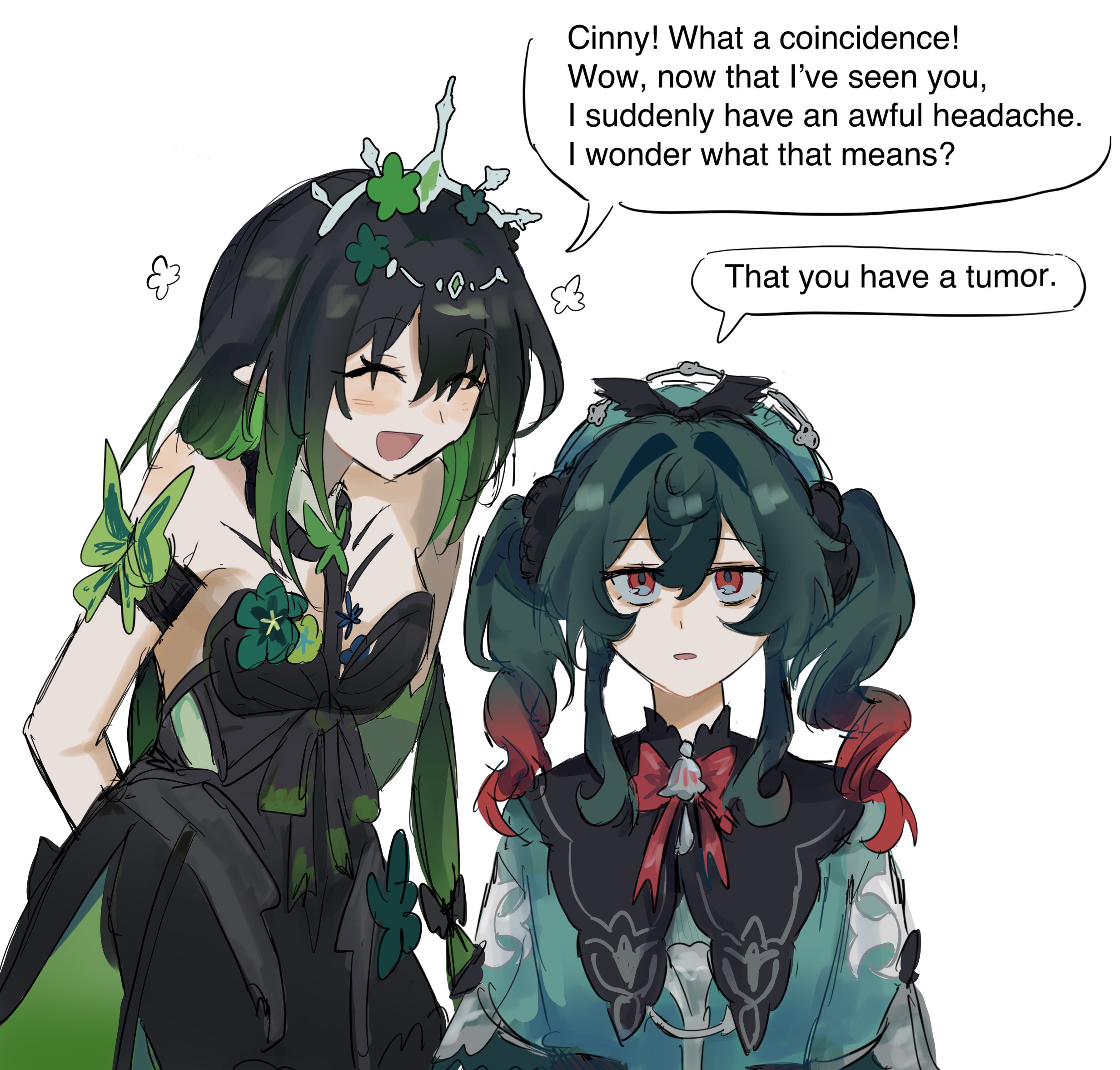 2girls :d alternate_color armband bare_shoulders black_dress black_hair blush bow bowtie breasts butterfly_ornament castorice_(honkai:_star_rail) closed_eyes commentary dress english_commentary english_text flower gradient_hair green_flower green_hair hair_between_eyes hair_flower hair_intakes hair_ornament highres honkai:_star_rail honkai_(series) hyacine_(honkai:_star_rail) jewelry long_hair medium_breasts multicolored_hair multiple_girls nsuntens open_clothes open_mouth red_bow red_bowtie red_eyes red_hair simple_background sketch smile speech_bubble twintails two-tone_hair white_background white_tiara