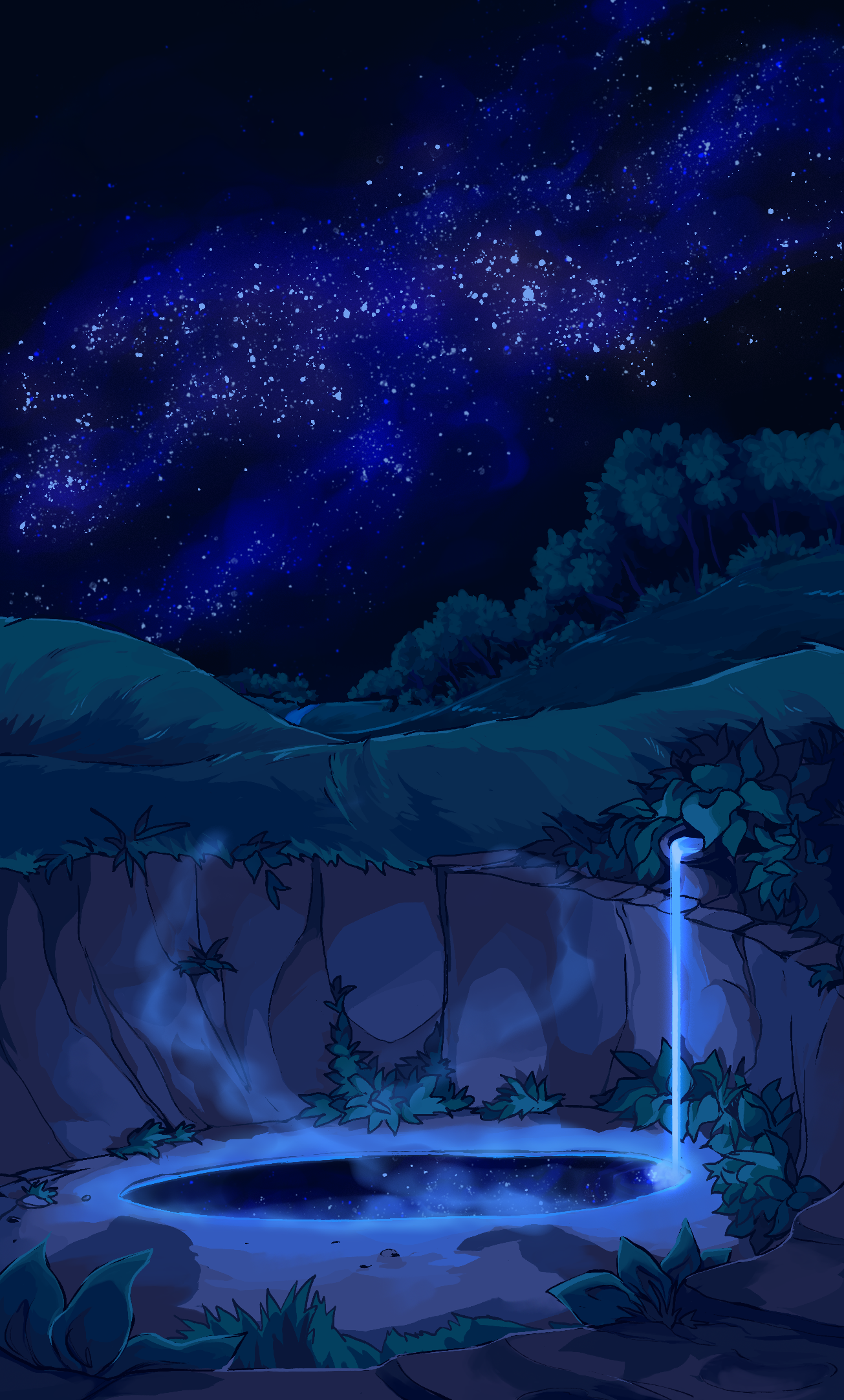 bush commentary english_commentary glowing grass highres in-universe_location moonpool_(warrior_cats) nature nifty-senpai night no_humans outdoors reflection reflective_liquid scenery sky star_(sky) starry_sky tree warrior_cats water waterfall