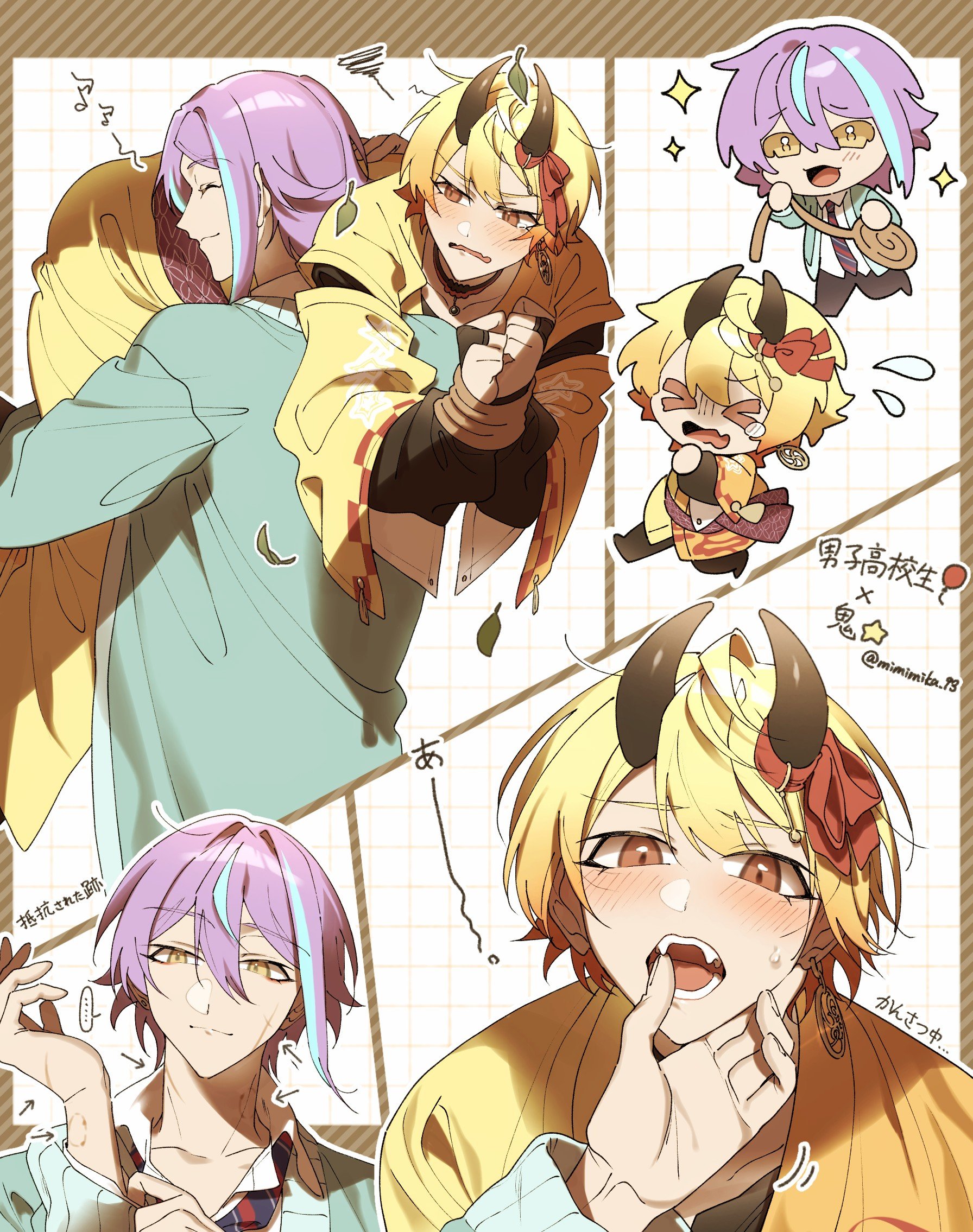 2boys bite_mark bound bound_wrists chibi chibi_inset closed_eyes closed_mouth commentary_request fangs highres horns kamishiro_rui kamiyama_high_school_uniform_(project_sekai) long_sleeves looking_at_another male_focus mimimika_93 multiple_boys official_alternate_costume project_sekai purple_hair red_ribbon ribbon school_uniform shinnen_kotohogu_inori_no_mai_(project_sekai) sparkle teeth tenma_tsukasa watermark yaoi yellow_eyes