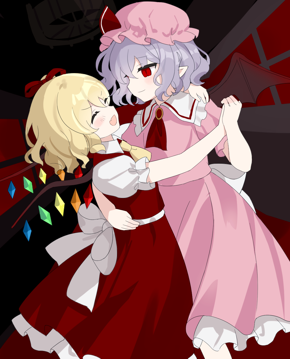 2girls ascot back_bow bat_wings blonde_hair blush bow chimi_(s2yuyukos2) collared_shirt commentary crystal crystal_wings dancing flandre_scarlet frilled_shirt_collar frilled_skirt frills hat hat_ribbon highres holding_hands mob_cap multicolored_wings multiple_girls open_mouth pink_hat pointy_ears puffy_short_sleeves puffy_sleeves purple_hair red_ascot red_eyes red_skirt red_vest remilia_scarlet ribbon shirt short_sleeves siblings sisters skirt skirt_set smile touhou vest white_bow white_shirt wings yellow_ascot