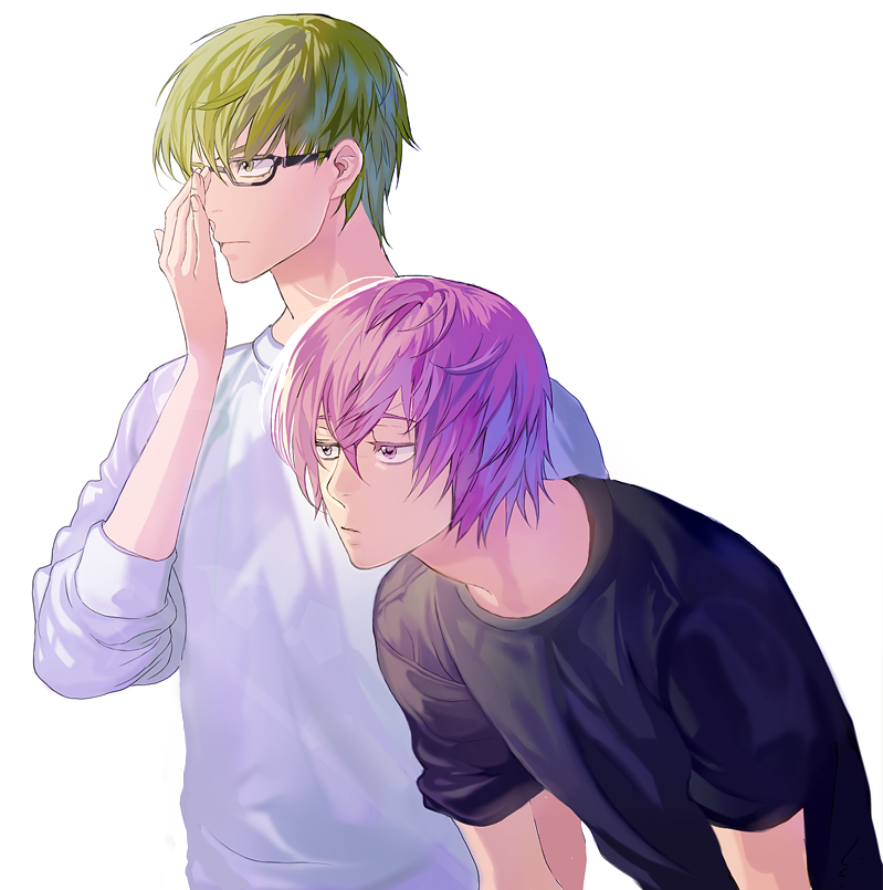 2boys adjusting_eyewear aso_lago black-framed_eyewear black_shirt closed_mouth commentary_request glasses green_hair kuroko_no_basuke looking_ahead male_focus midorima_shintarou multiple_boys murasakibara_atsushi pink_hair rectangular_eyewear shirt short_hair simple_background sleeves_pushed_up upper_body white_background white_shirt