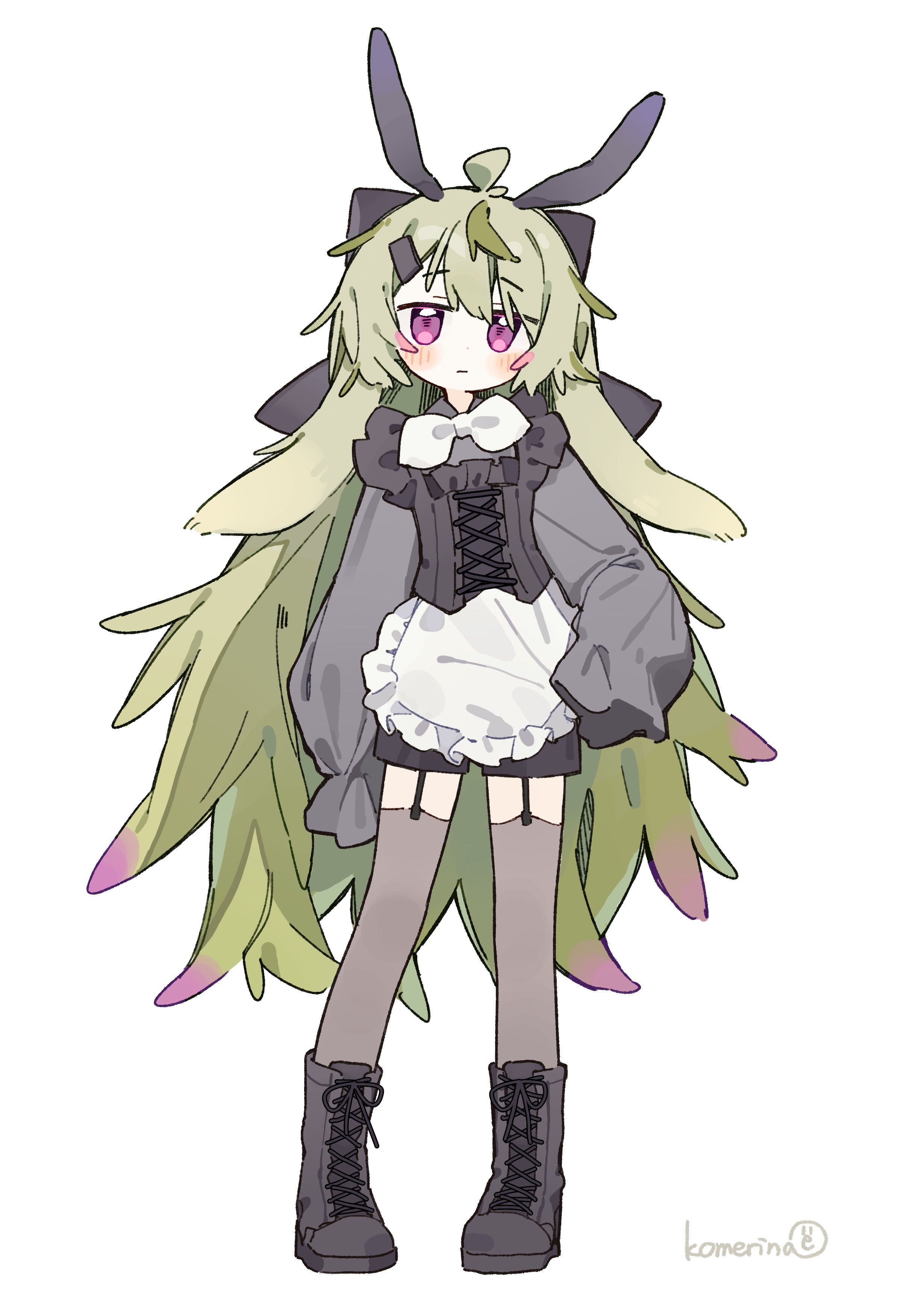 1girl absurdres ahoge animal_ears black_boots black_bow black_corset black_shirt black_shorts blush boots bow closed_mouth commentary_request corset full_body garter_straps green_hair grey_thighhighs hair_bow highres komerina lace-up_boots long_hair long_sleeves looking_at_viewer original pink_eyes sea_slug_ears sea_slug_girl shirt shorts simple_background sleeves_past_fingers sleeves_past_wrists solo standing thighhighs white_background