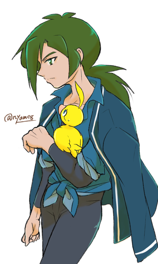 1boy ahiru_(duck)_(princess_tutu) ahiru_(princess_tutu) ahoge ballerino bird blue_eyes commentary_request duck fakir_(princess_tutu) green_eyes green_hair male_focus official_alternate_costume ponytail princess_tutu yameshoko