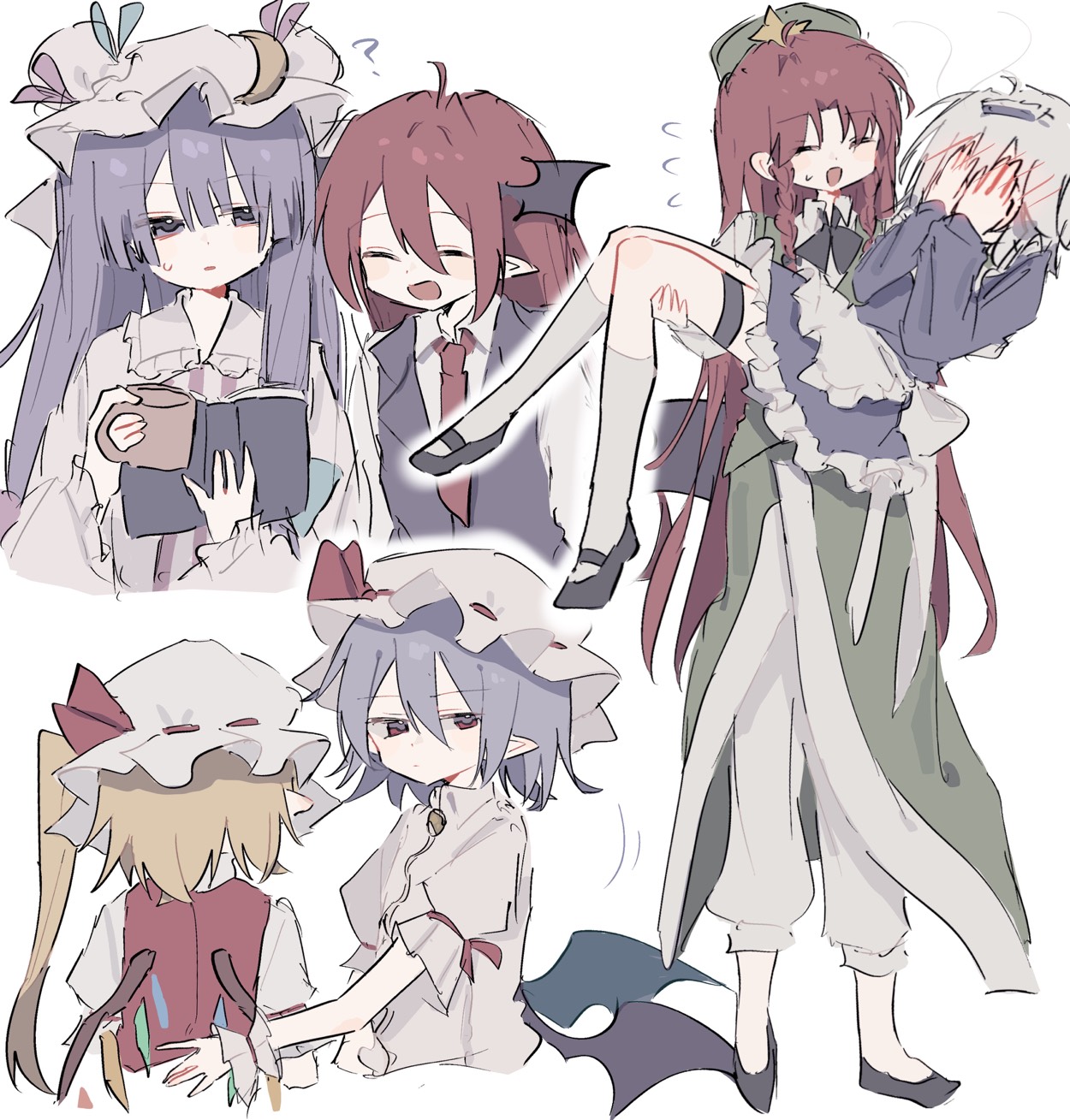 6+girls :d apron bat_wings black_shoes black_vest blonde_hair blue_dress blue_hair book braid carrying chinese_clothes commentary_request covering_face crescent crescent_hat_ornament crystal_wings cup dress embarrassed flandre_scarlet full_body green_skirt green_vest hair_between_eyes hat hat_ornament head_wings highres holding holding_book holding_cup hong_meiling izayoi_sakuya koakuma long_hair long_sleeves looking_at_another looking_at_viewer maid maid_apron maid_headdress maruten_moko medium_hair mob_cap multiple_girls necktie open_mouth pants parted_lips patchouli_knowledge pointy_ears princess_carry purple_eyes purple_hair red_hair red_necktie red_vest remilia_scarlet robe shirt shoes short_sleeves siblings side_ponytail skirt smile socks star_(symbol) star_hat_ornament striped_clothes striped_dress thigh_strap touhou twin_braids upper_body vampire very_long_hair vest white_background white_hair white_pants white_robe white_shirt white_socks wings wrist_cuffs