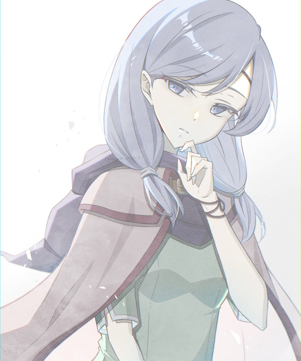 1girl breasts cape commentary_request fingernails fire_emblem fire_emblem:_path_of_radiance green_shirt highres ilyana_(fire_emblem) long_hair low-tied_long_hair low_twintails nintendo nowa_mi112 purple_eyes purple_hair shirt short_sleeves simple_background small_breasts solo twintails upper_body white_background white_cape