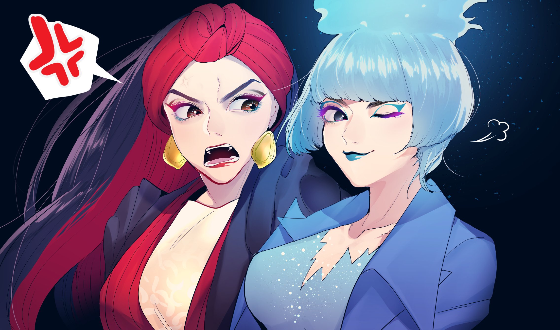 2girls animification black_hair blue_hair blue_lips closed_mouth commentary_request disneyland dress earrings farja fiery_hair fire formal_clothes highres jewelry lipstick long_hair long_sleeves makeup ms._hades multiple_girls rl10_02 smile